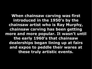 Chainsaw carving originated in the 1950s when Ray Murphy introduced it as an art form. In the early 1960s, chainsaw companies began marketing their products at fairs and expos featuring chainsaw carving. While chainsaws seem like unusual tools for art, many artists have been using them to sculpt wood into various forms like animals, furniture, and garden decorations. It requires years of practice and effort to gain the skills to transform blocks of wood into detailed sculptures seemingly with ease using a chainsaw.