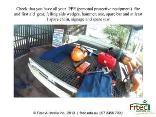 The document outlines the basic procedures and safety measures for chainsaw training and tree felling, emphasizing the importance of personal protective equipment and maintaining tools. It provides step-by-step instructions for making cuts, setting directions, and ensuring safety during the felling process. The training is nationally accredited and includes precautions for working in confined spaces.