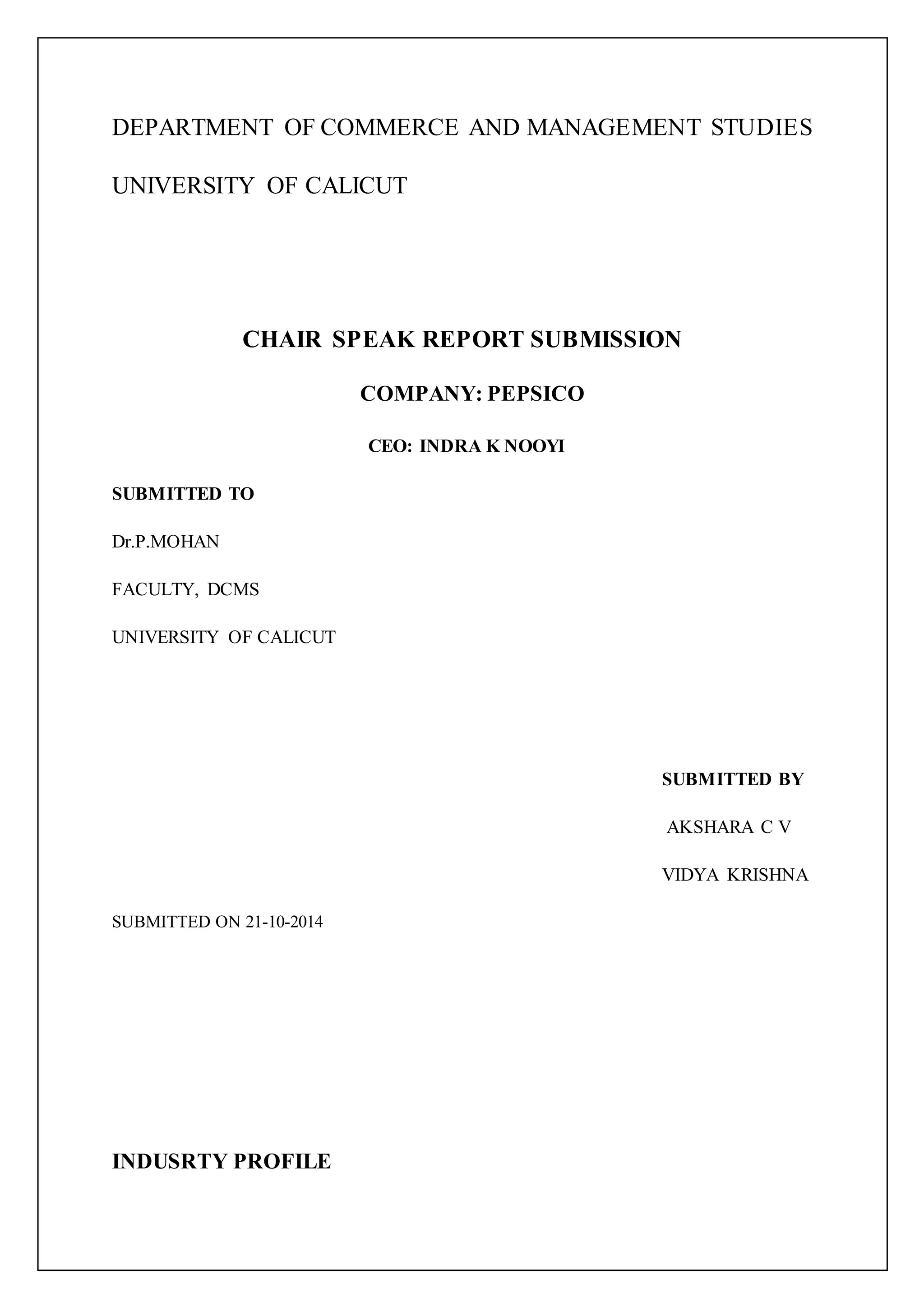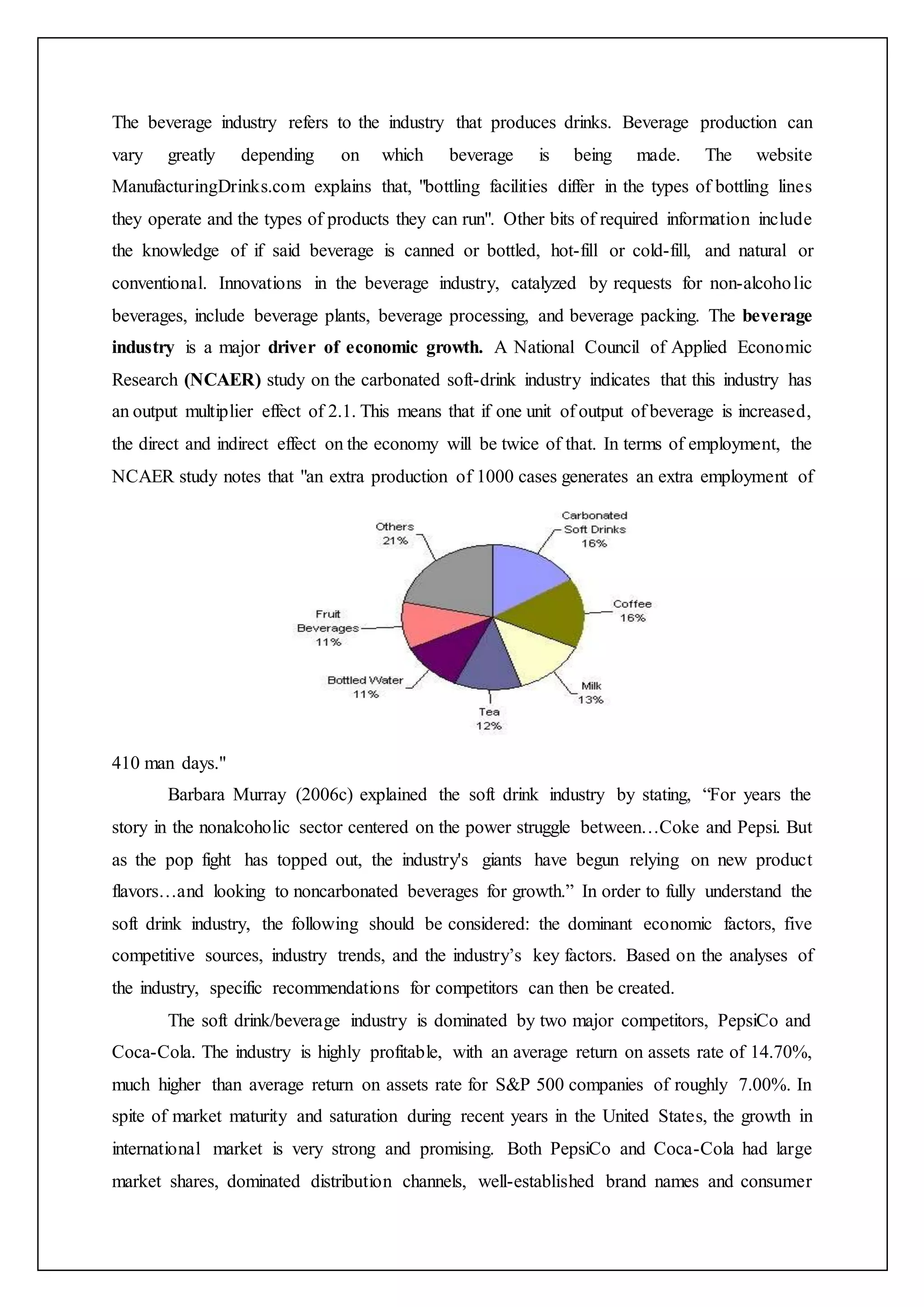 This document provides information about PepsiCo and the beverage industry. It discusses PepsiCo's CEO, Indra Nooyi, and provides an industry profile that describes the beverage industry and dominant economic factors like market size and growth rate. It also analyzes the financial statements of major companies like PepsiCo, Coca-Cola, and Cadbury Schweppes and notes trends in the industry like increasing globalization and changing consumer preferences.