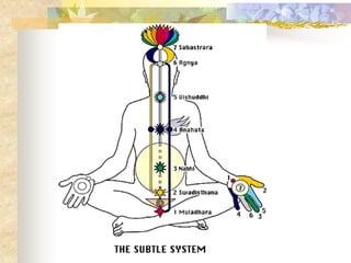 The document discusses the chakra system as a subtle energy system in the body. It describes the 7 major chakras located along the spinal cord, starting from the root chakra at the base of the spine to the crown chakra at the top of the head. Each chakra is associated with a specific gland or part of the body and governs different physical, mental and emotional attributes when balanced versus imbalanced. The balanced flow of energy through the chakras supports overall health and well-being.