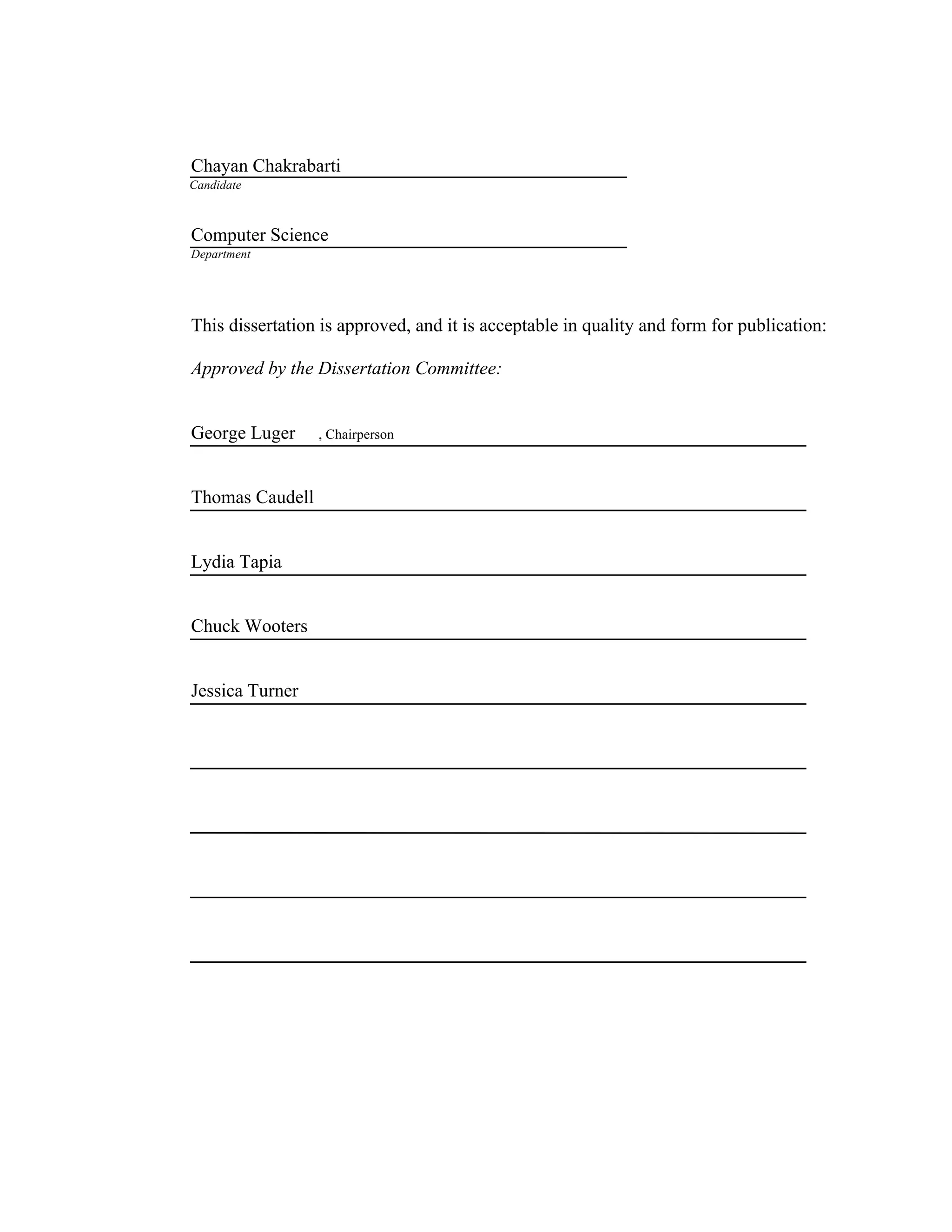 This dissertation describes Chayan Chakrabarti's work on developing an artificial conversation system using knowledge representation, learning, and pragmatics. The dissertation is approved by Chakrabarti's committee consisting of George Luger, Thomas Caudell, Lydia Tapia, Chuck Wooters, and Jessica Turner.