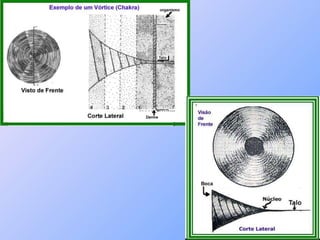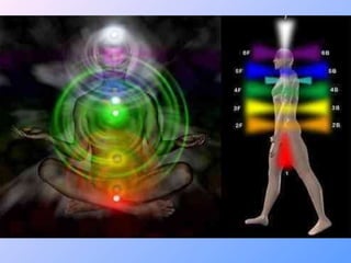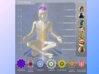 O documento descreve os chakras, centros energéticos do corpo humano. Explica que existem 7 chakras principais que se relacionam com diferentes aspectos físicos, emocionais e espirituais. Também fornece detalhes sobre a localização, função, glândula associada e possíveis desequilíbrios de cada um dos sete principais chakras: Sahasrara, Ajna, Vishuddha, Anahata, Manipura, Swadhisthana e Muladhara.