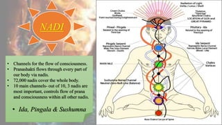 The document discusses the concepts of nadis, ida, pingala, and sushumna channels which carry prana and consciousness through the body. It describes the 7 major chakras located along the spinal cord, from muladhara at the base to sahasrara at the crown of the head. Each chakra is associated with specific physical, mental, emotional and spiritual qualities. Kundalini is described as a dormant potential force located in muladhara chakra. The document outlines practices like yoga, pranayama and meditation that can be used to awaken kundalini energy and ascend it up the sushumna nadi to higher chakras.