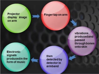 This document discusses Skinput technology, which uses a person's arm as a touchscreen interface. It works by using a small projector to display a menu on the arm and an acoustic detector to sense sound vibrations from taps on the arm. The technology detects both longitudinal and transverse waves created from taps. It has applications for mobile devices, gaming, and accessibility. Skinput provides a touch-free way to interact with technology and could open new possibilities for interacting with devices.