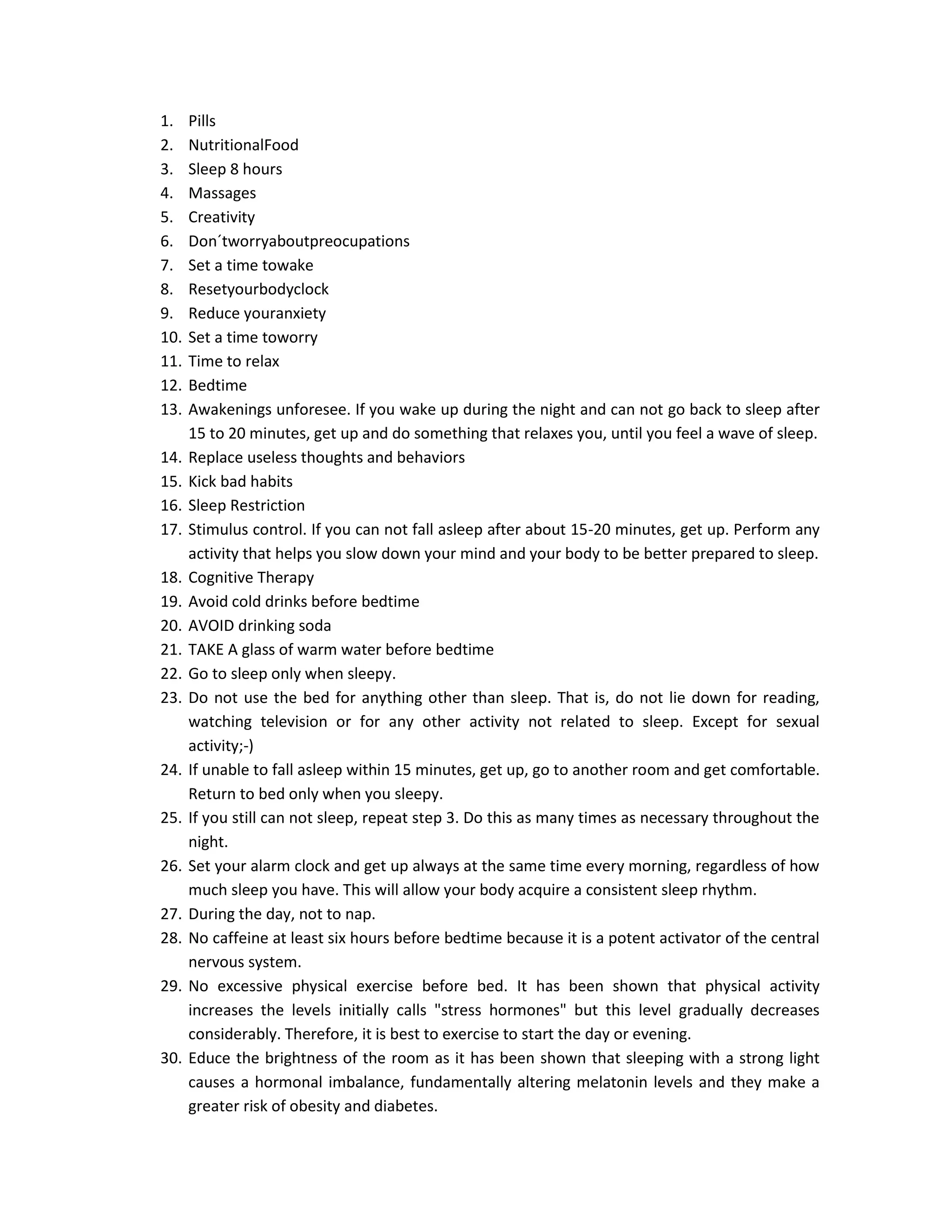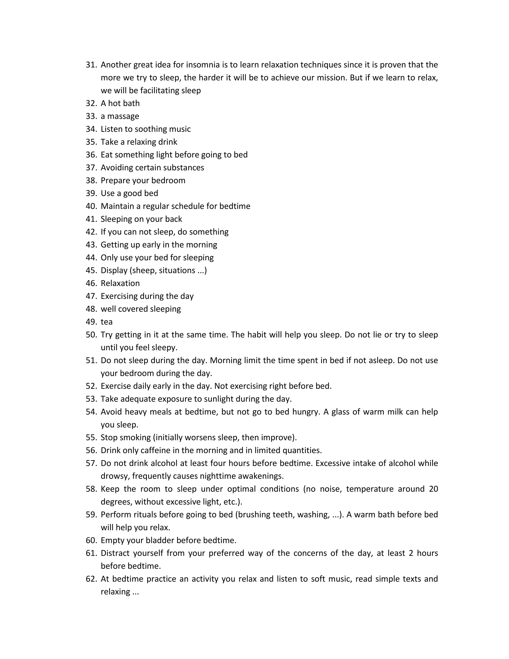 This document provides 99 tips for improving sleep and dealing with insomnia. Some key recommendations include establishing a regular sleep schedule by going to bed and waking up at the same times each day, avoiding screens, caffeine, and heavy meals before bed, engaging in relaxing activities before sleep, getting daily exercise, and using relaxation techniques if unable to fall asleep like getting out of bed and relaxing in another room until sleepy. The document also suggests avoiding daytime naps, keeping a relaxing sleep environment, and using natural remedies like herbal teas to help induce sleep.