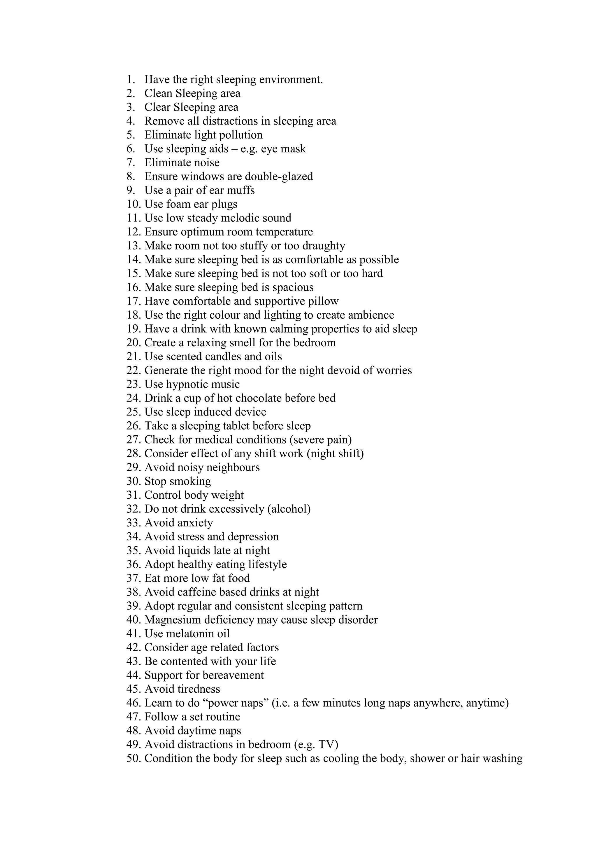 This document provides 100 tips for improving sleep quality and habits. It suggests creating the proper sleeping environment by removing distractions, light, noise and ensuring comfort. It also recommends establishing a relaxing routine before bed, avoiding stimulants like caffeine and screens, as well as managing stress, anxiety, medical conditions and lifestyle factors that could disrupt sleep. Adopting a regular sleep schedule, relaxation techniques, exercise and healthy eating are also emphasized.