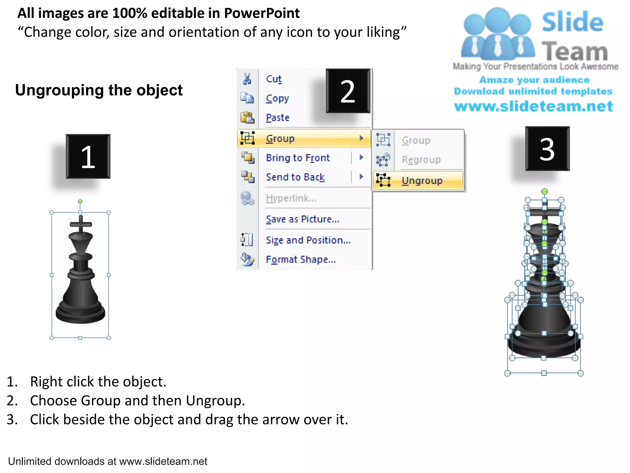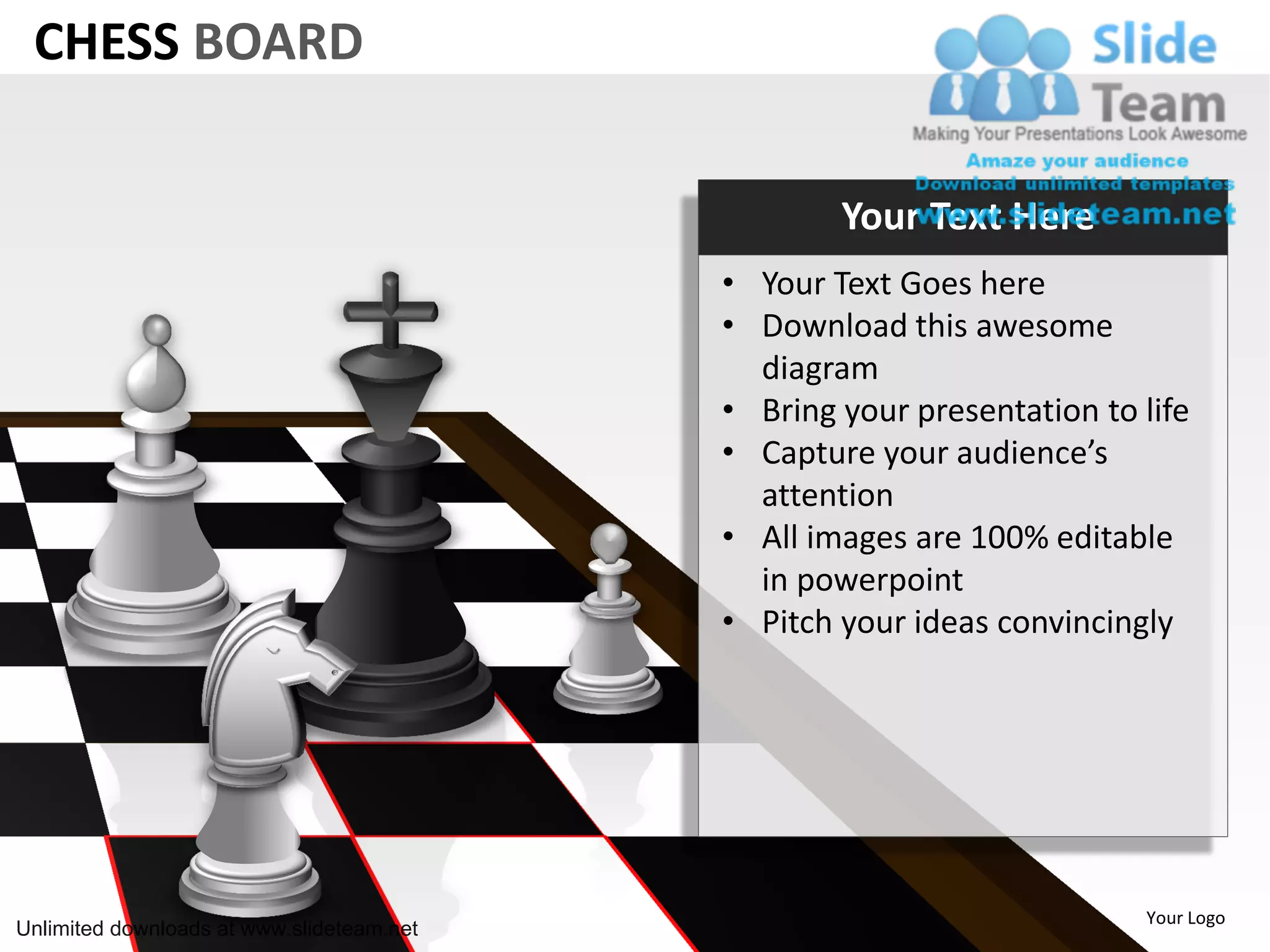This document provides instructions for editing a chess board diagram downloaded from slideteam.net. It explains how to ungroup objects in the diagram so individual pieces can be edited, and how to change the color of shapes by selecting them, right clicking, and choosing format options. The chess board diagram and editing instructions are meant to help users customize slides and engage audiences.
