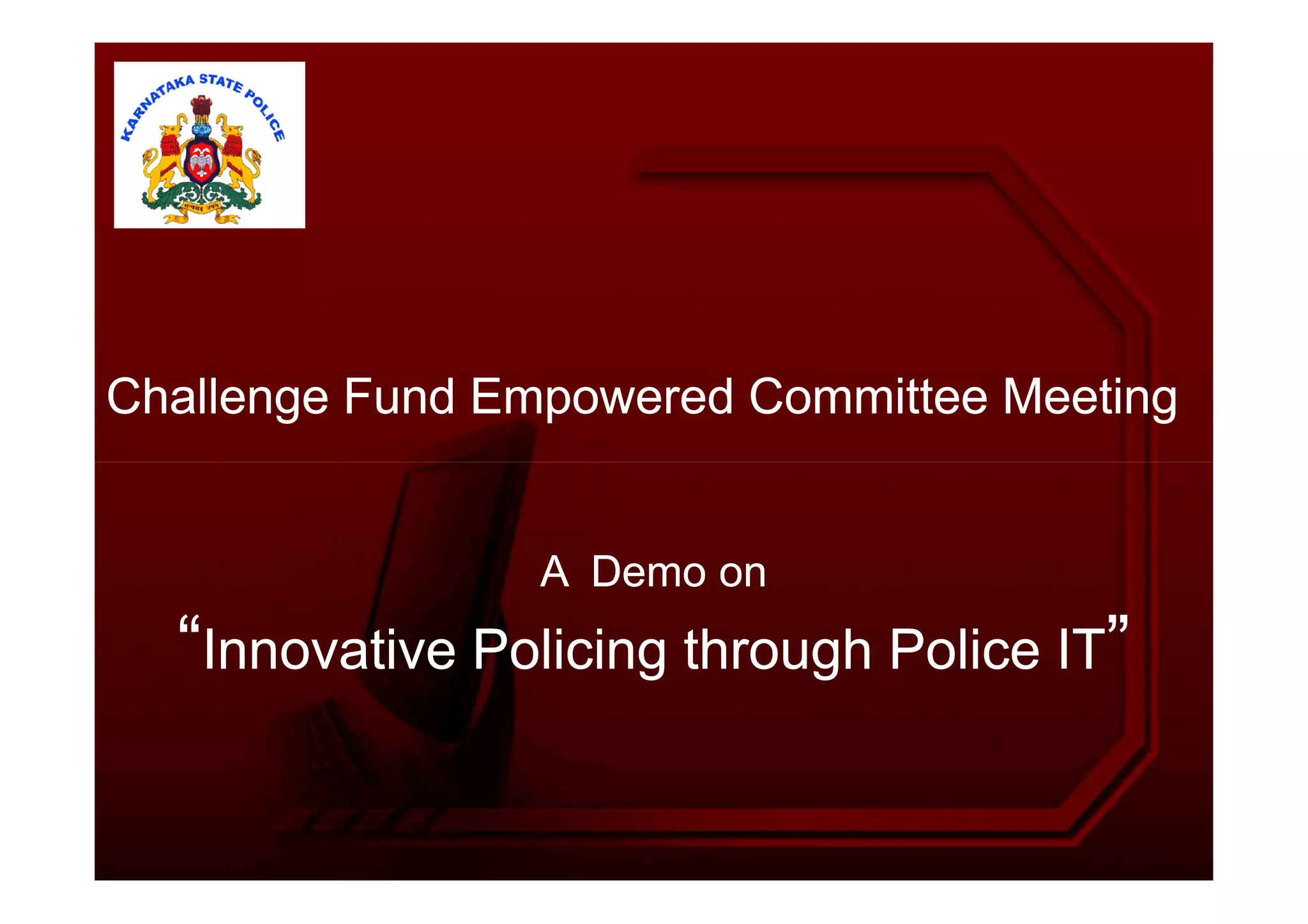 The document provides an overview of integrating several legacy police systems with an innovative new police IT system. It summarizes key legacy systems like e-BEAT for beat management, G-CARE for crime analysis, e-Khajane for financial management, e-Procurement for procurement, a GPS-based system for vehicle tracking, and a Traffic Management Center. It outlines proposed architectures for integrating each legacy system to fetch and share data with the new police IT system, bringing benefits like centralized access, increased functionality, and improved reporting across all levels of policing.
