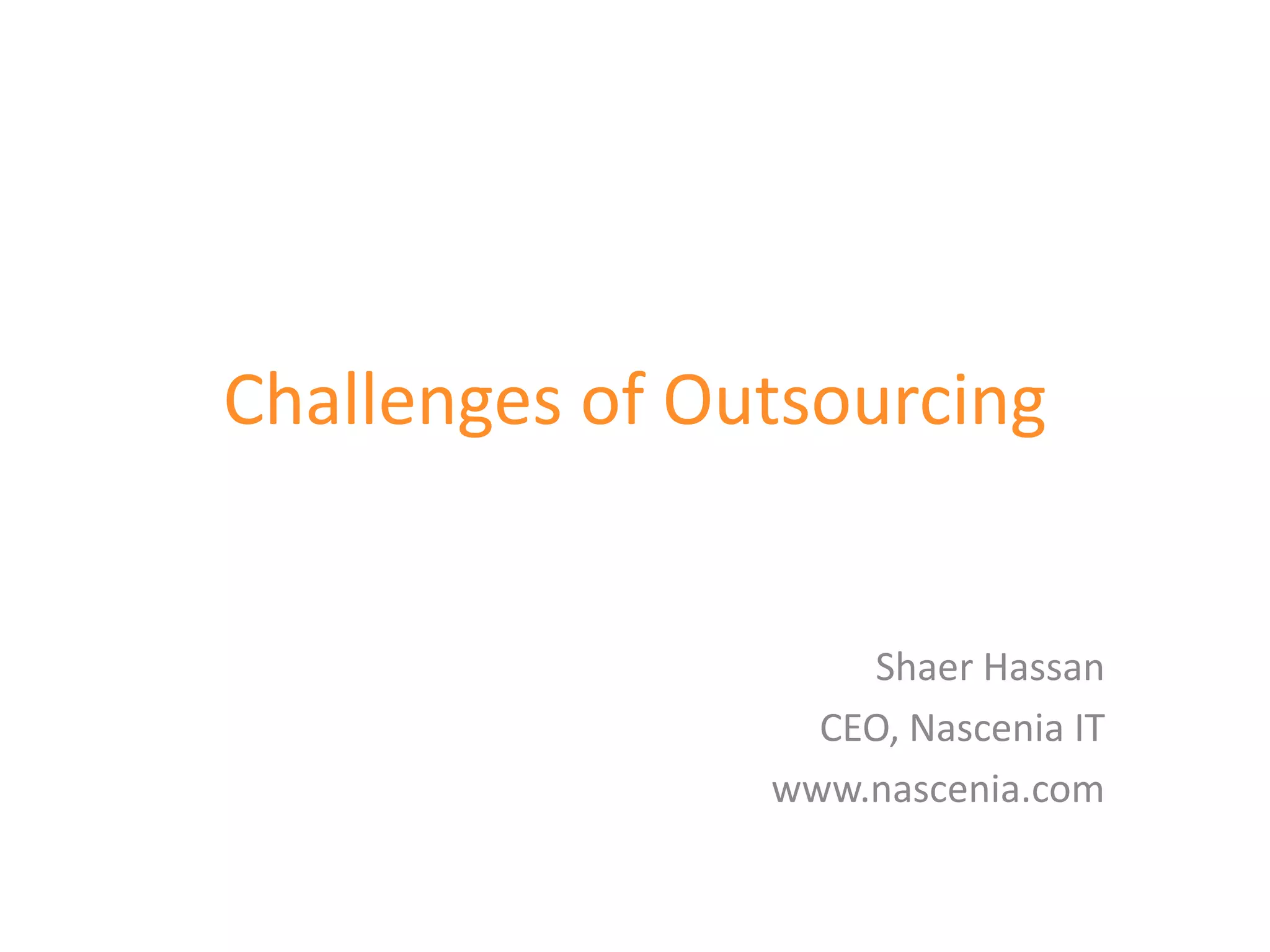 The document discusses the challenges of outsourcing, including communication barriers due to lack of nonverbal cues and time zone differences. It offers solutions such as clear communication, well-documented requirements, and the use of various project management tools to enhance collaboration and efficiency. It concludes by highlighting the benefits of outsourcing, such as cost savings, increased organization, and access to a skilled workforce.