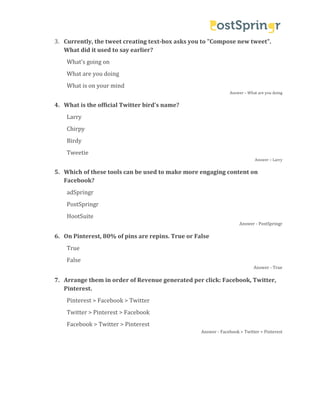 This document tests social media knowledge through multiple choice questions about various platforms. It covers topics like the Twitter fail whale, the name of Twitter awards, past and current Twitter composing boxes, official Twitter bird name, tools for engaging Facebook content, Pinterest pinning stats and features, order of platform ad revenue, Twitter clients, average Twitter followers, Instagram filters and photo sizes. The questions help assess familiarity with details on major social networks.