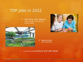 1) The document discusses trends and jobs that will be important in 2022, including working with the elderly as populations age, agriculture becoming more sustainable, and companies producing and selling ideas.