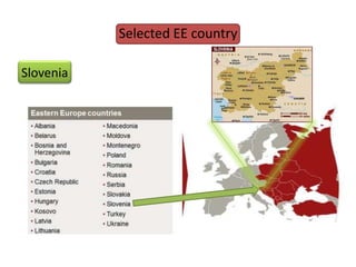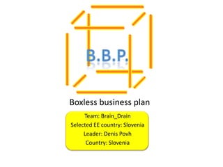 The document is a business plan from the team Brain_Drain selecting Slovenia as their Eastern European country. It outlines Slovenia's disadvantages like bureaucracy and unemployment, as well as advantages like a strategic location and educated workforce. The business plan focuses on technology, engineering, alternative energy, and the environment to create a bright future for Slovenia and will be executed and improved on by experts supervising company progress and performance.