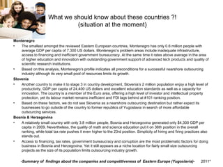 The document summarizes findings about the competitiveness of countries that were formerly part of Yugoslavia in Eastern Europe. It analyzes the economies, strengths, and weaknesses of Montenegro, Slovenia, Bosnia and Herzegovina, Serbia, Croatia, and Macedonia. Key points include: