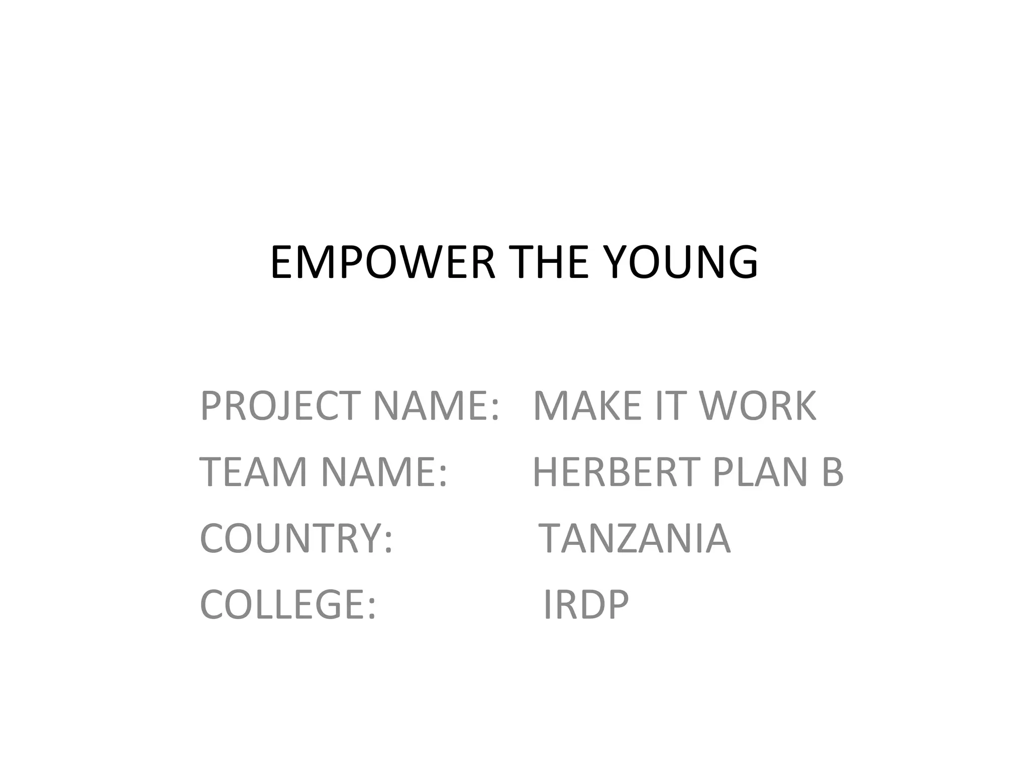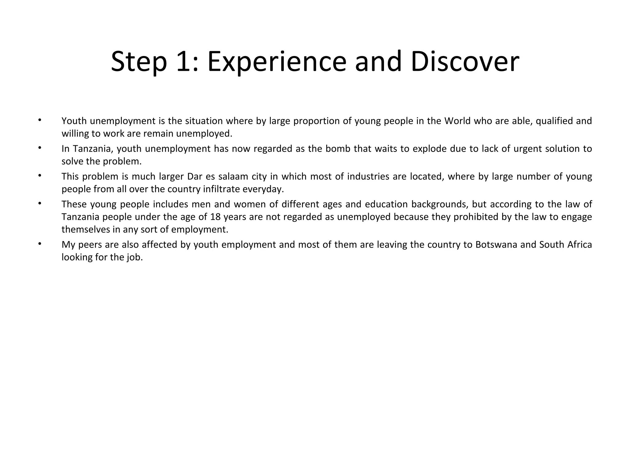 The document proposes solutions to address youth unemployment in Tanzania. It identifies several causes of unemployment, including poor government policies, lack of access to financial resources, and inappropriate education curricula. The author suggests implementing entrepreneurship training programs, prioritizing the agricultural sector, revising education curricula, and providing microcredit loans to empower youth. The proposed solutions aim to engage over 1,000,000 young people through these programs over six months to help reduce the unemployment rate.