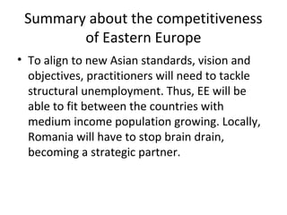 The document discusses strategies for improving competitiveness in Eastern Europe, specifically Romania. It proposes tackling structural unemployment, stopping brain drain, and redesigning fiscal and production models to increase purchasing power. Agriculture and renewable energy are seen as growth areas that could make Romania a stronger exporter by 2030 if given proper support. Close monitoring of reforms adapted from Asian models will be needed to promote sustainable economic recovery and competitiveness in the region.
