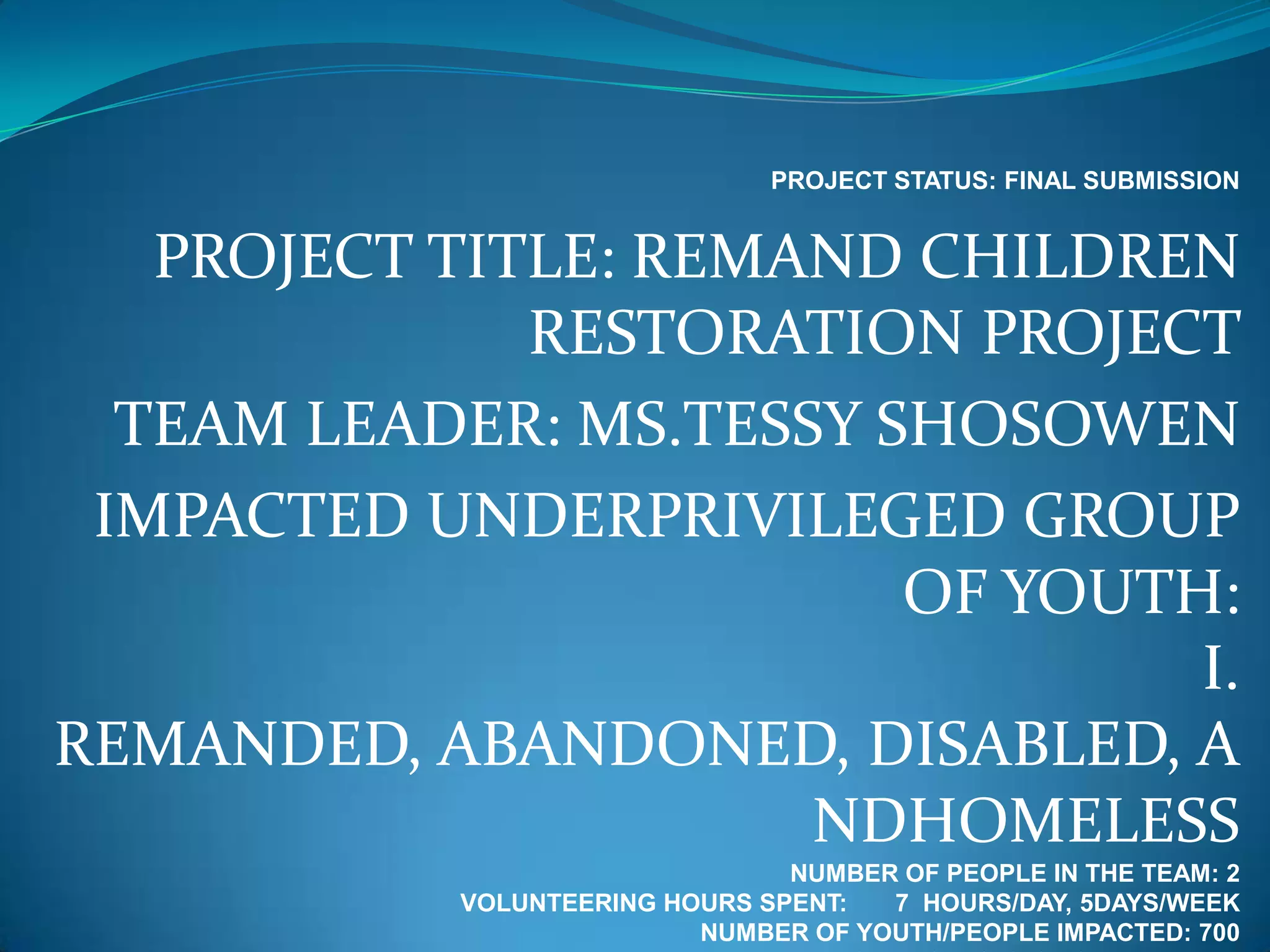 The project aims to provide counseling, education, training and support to empower remanded, abandoned, disabled and homeless youth. The team has impacted over 700 youth through their vocational training center and work in Abeokuta Remand Home. They have engaged 2 volunteers working 7 hours per day, 5 days per week. Feedback from impacted youth has been positive, praising the project's multi-pronged approach to promoting human rights. While similar projects exist, this one works within existing remand homes to incorporate social enterprises, curriculum and long-term mentoring into the education system. There is potential to expand the innovative project to more regions and globally with additional funding, staff, and partnerships.