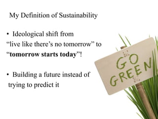 The document discusses the importance of sustainability for businesses. It advocates shifting from a short-term mindset of "live like there's no tomorrow" to a long-term view of "tomorrow starts today." It recommends that companies educate employees about sustainability, benchmark competitors, listen to critical feedback, and innovate to use resources efficiently and adapt to changing consumer and regulatory demands. The document provides examples of companies with strong sustainability practices and emphasizes that becoming sustainable requires ongoing education and innovation.
