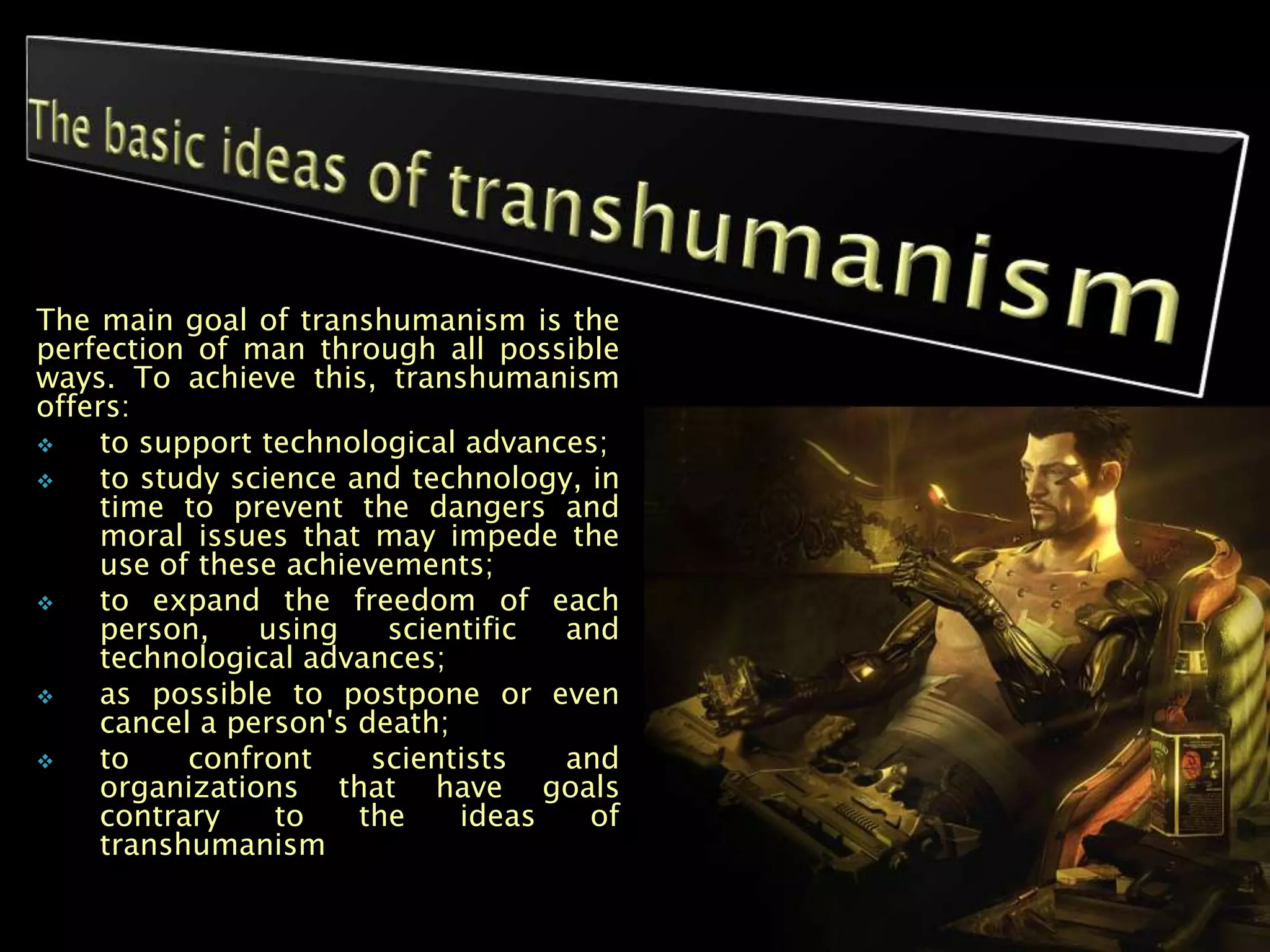 Transhumanism aims to enhance human capabilities through technology, but this raises issues that require global cooperation to address. The rapid advancement of technologies that could augment the human body and mind may profoundly impact society in the next 15-20 years before people are prepared. All nations must work together to 1) raise awareness of potential problems, 2) limit artificial evolution research due to risks, and 3) focus technology on helping the sick rather than altering baseline human abilities, to avoid inequality, unrest, loss of free will, and other threats to human nature and global stability. Failure to do so could divide society and endanger the human race.