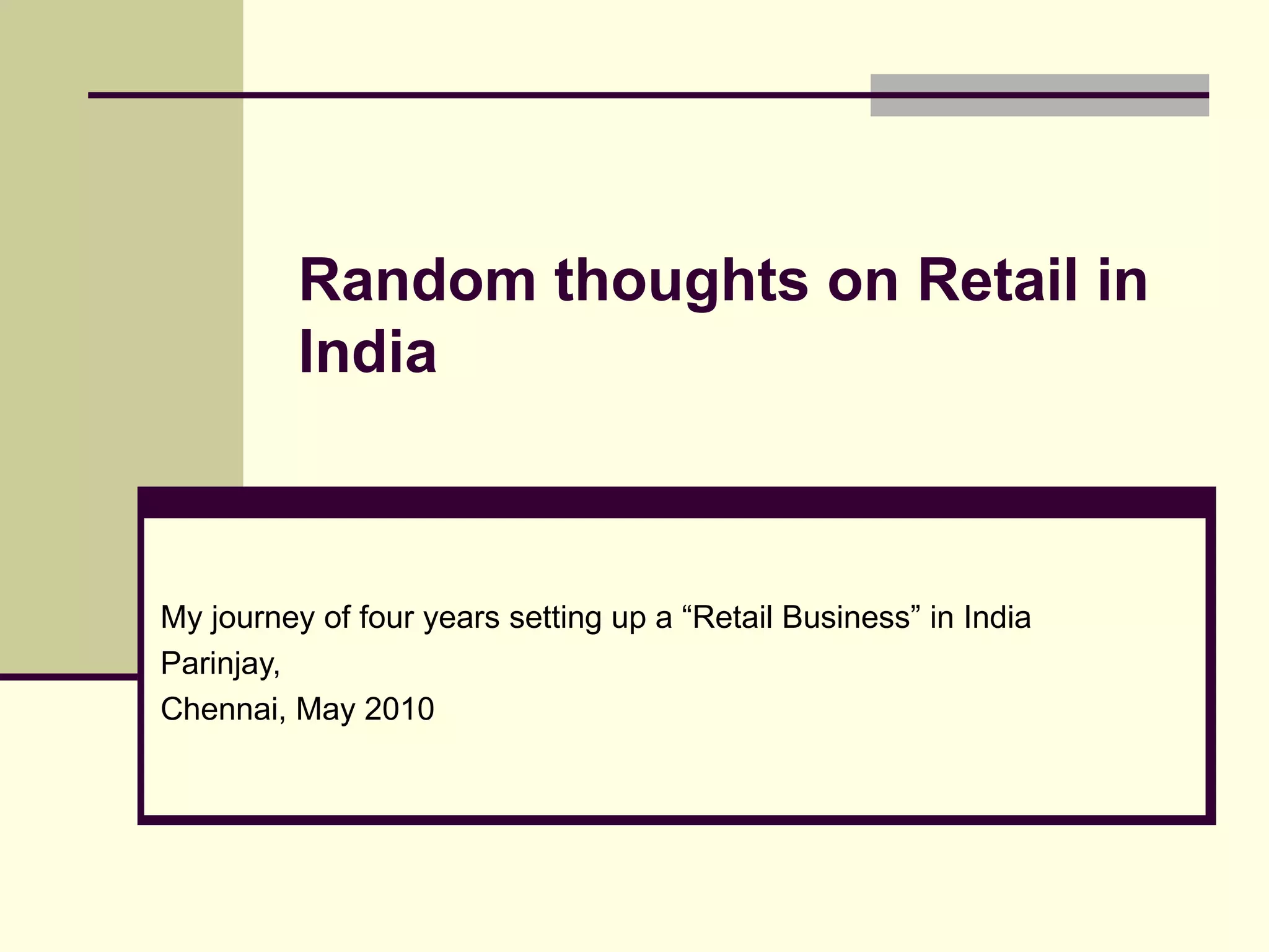 The document discusses the opportunities and challenges facing the retail business in India. It notes that while India presents a large opportunity due to its growing middle class, retail has not yet reached critical mass to unlock economies of scale. Cost structures are also high compared to revenues. Consumer behavior also differs from other markets as Indians tend to shop for occasions and make purchases from multiple channels. Infrastructure and regulatory frameworks need further development to better support the retail sector. Success will require a long term view and flexibility, with an approach tailored specifically for the Indian market.