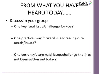 The document discusses challenges faced by rural communities in 2014, focusing on issues such as rural broadband, an aging population, and commissioning of rural services. It emphasizes the need for practical solutions, including collaboration among social enterprises and pushing rural issues onto mainstream planning agendas. Additionally, it highlights the importance of addressing sustainability and barriers between agencies and rural residents.