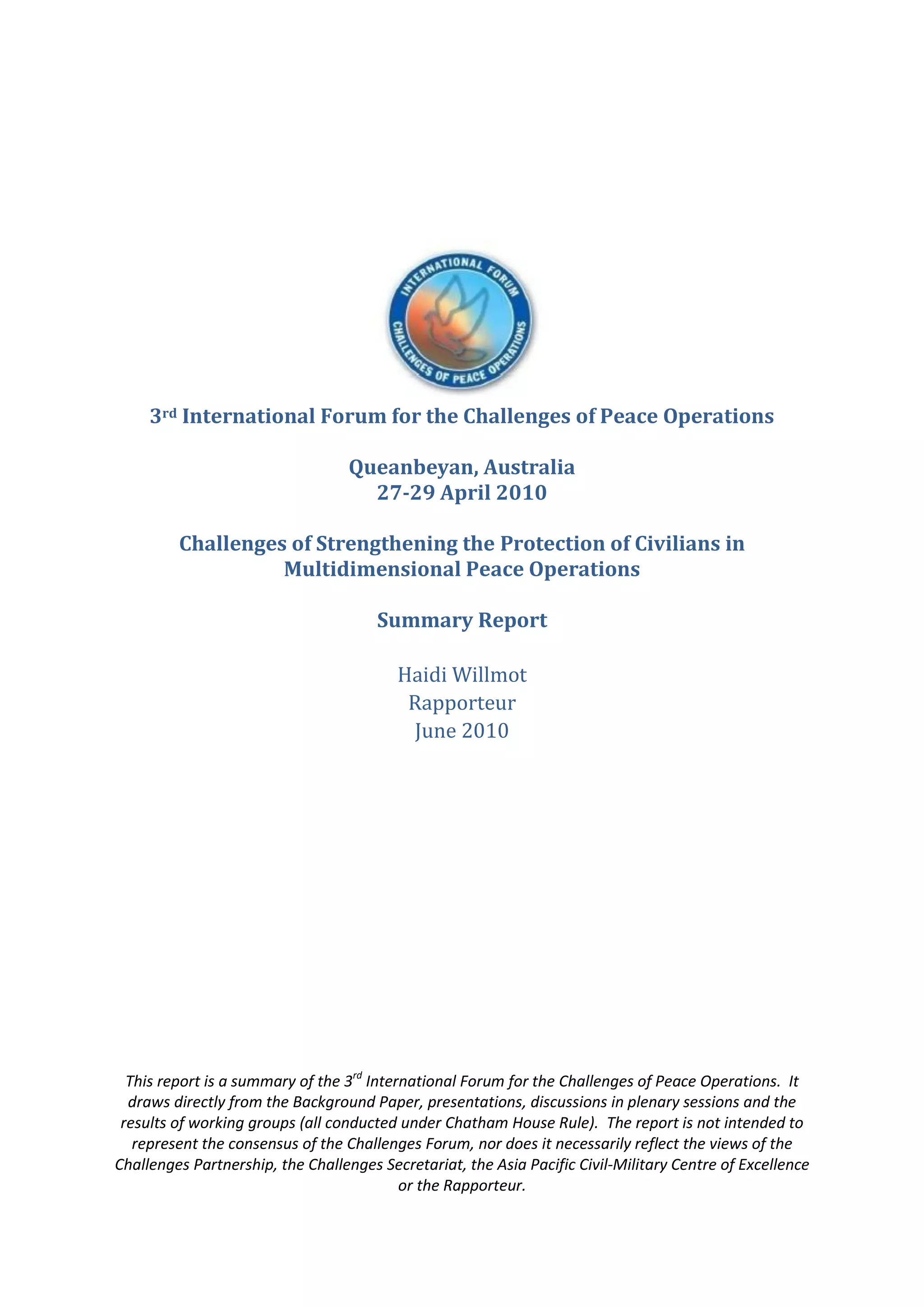 The 3rd International Forum for the Challenges of Peace Operations held in April 2010 in Queanbeyan, Australia, focused on the complexities of protecting civilians in multidimensional peace operations. The forum generated discussions on the importance of civilian protection, the challenges faced, and outlined recommendations for enhancing the effectiveness of peacekeeping efforts. It emphasized the need for immediate action from various actors involved in peacekeeping to improve civilian protection practices, as well as the ongoing commitment from the international community.