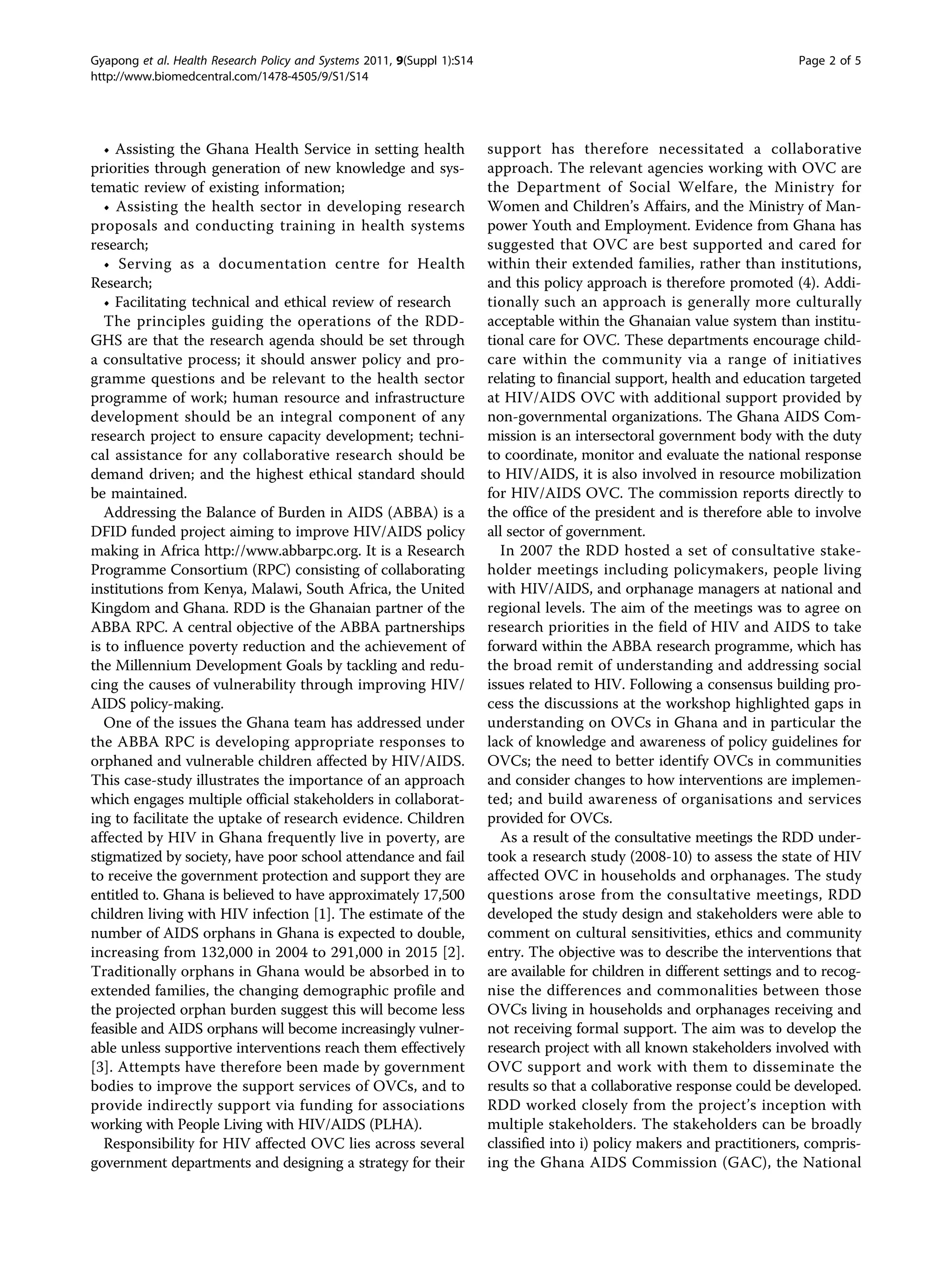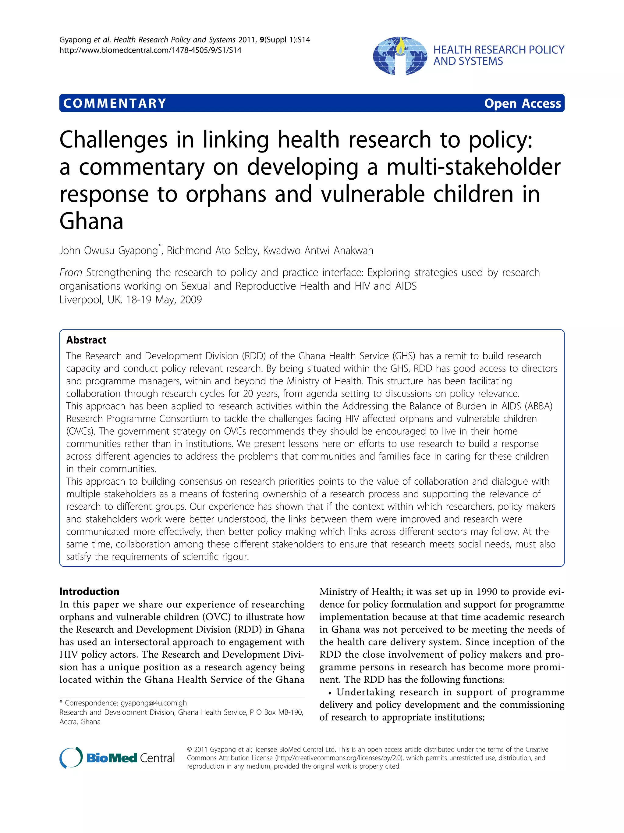 The document discusses challenges in linking health research to policy in Ghana. It describes how the Research and Development Division of the Ghana Health Service used a collaborative approach to build consensus on research priorities related to orphans and vulnerable children affected by HIV/AIDS. Through stakeholder consultations, gaps in understanding this issue were identified and a research study was undertaken to assess the situation of HIV-affected children. The study informed policy by providing evidence on how to best support these children within their communities rather than institutions. The experience highlights the value of engaging multiple stakeholders to ensure research meets social needs and informs policymaking across sectors.