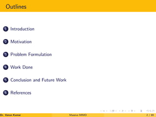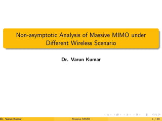 This document summarizes a presentation on analyzing massive MIMO systems under different wireless scenarios. It begins with background on mobile communication generations and challenges with exponentially growing data demand. It then discusses massive MIMO as a promising technology for 5G, noting it can support large numbers of users simultaneously and increase spectrum efficiency. However, challenges include hardware mismatch in TDD systems and highly correlated spatial gains. The presentation outlines analyzing the impact of these issues, as well as the feasibility of massive MIMO in cooperative networks. It proposes modeling hardware mismatch and deriving the probability distribution functions of amplitude and phase mismatches. It also discusses using different precoding techniques like zero-forcing to calculate signal-to-interference-plus-noise ratio in the down