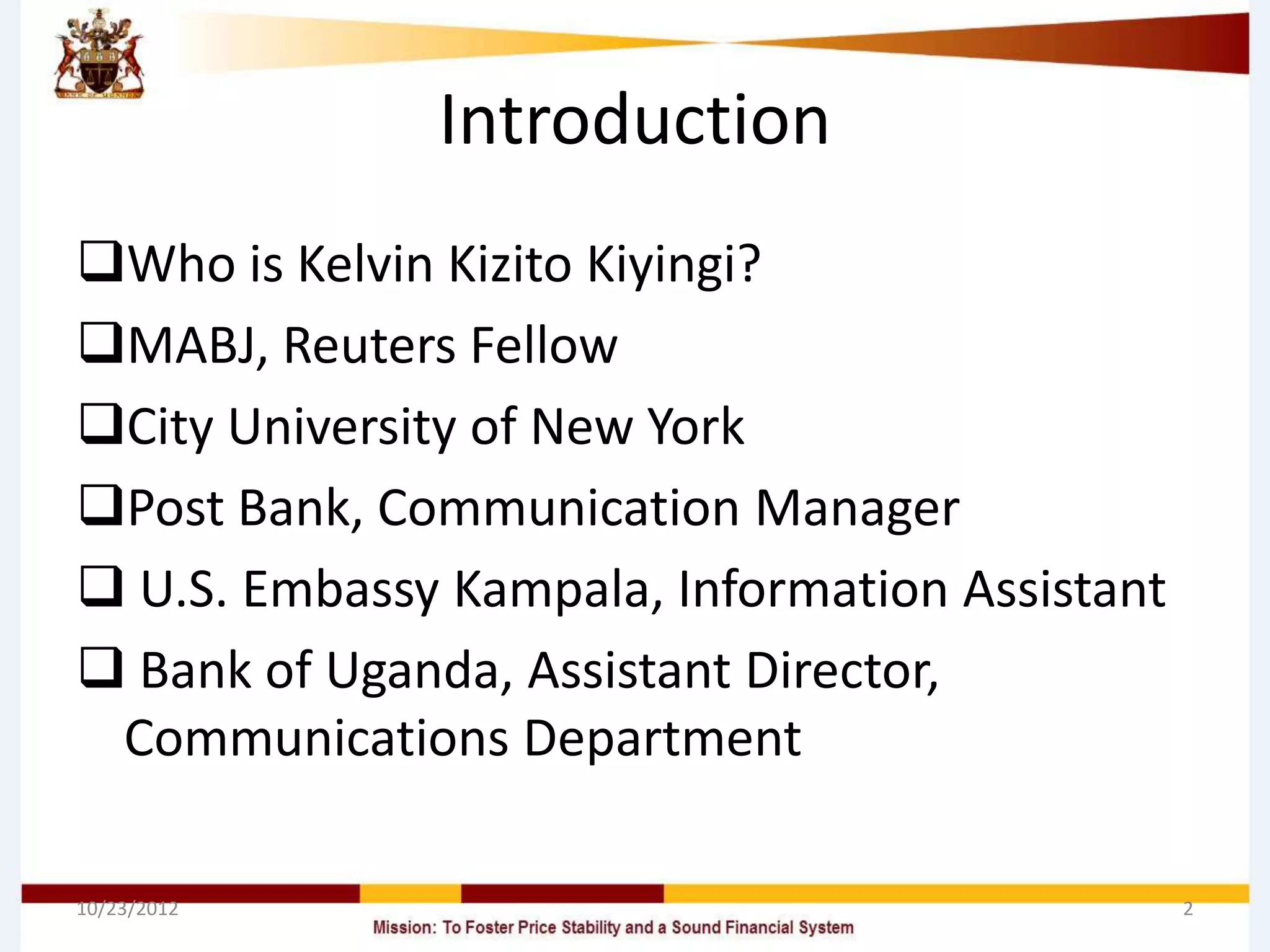 This document discusses the challenges of monetary policy communication at the Bank of Uganda. It provides background on Uganda's adoption of an inflation targeting lite monetary policy framework in 2011. It then outlines some of the key challenges in communicating monetary policy, including language barriers, low economic literacy, lack of informed debate, limited media capacity, and balancing informing the public with convincing them of policy decisions. It concludes by recommending increased use of local languages, ongoing media training, public awareness initiatives, improving the central bank website, and not being afraid of public debate.