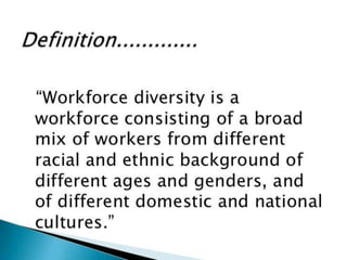 Diversity in the workforce can present several challenges for organizations including potential conflict among groups, communication issues due to differences in how people work, and resistance to change from established ways of doing things. Without acceptance of diversity, discrimination can occur along dimensions such as gender, religion, disability or cultural background. Negative attitudes may also lead to harassment of those who are different, and high turnover rates and absenteeism can be costly issues for companies struggling with diversity challenges.