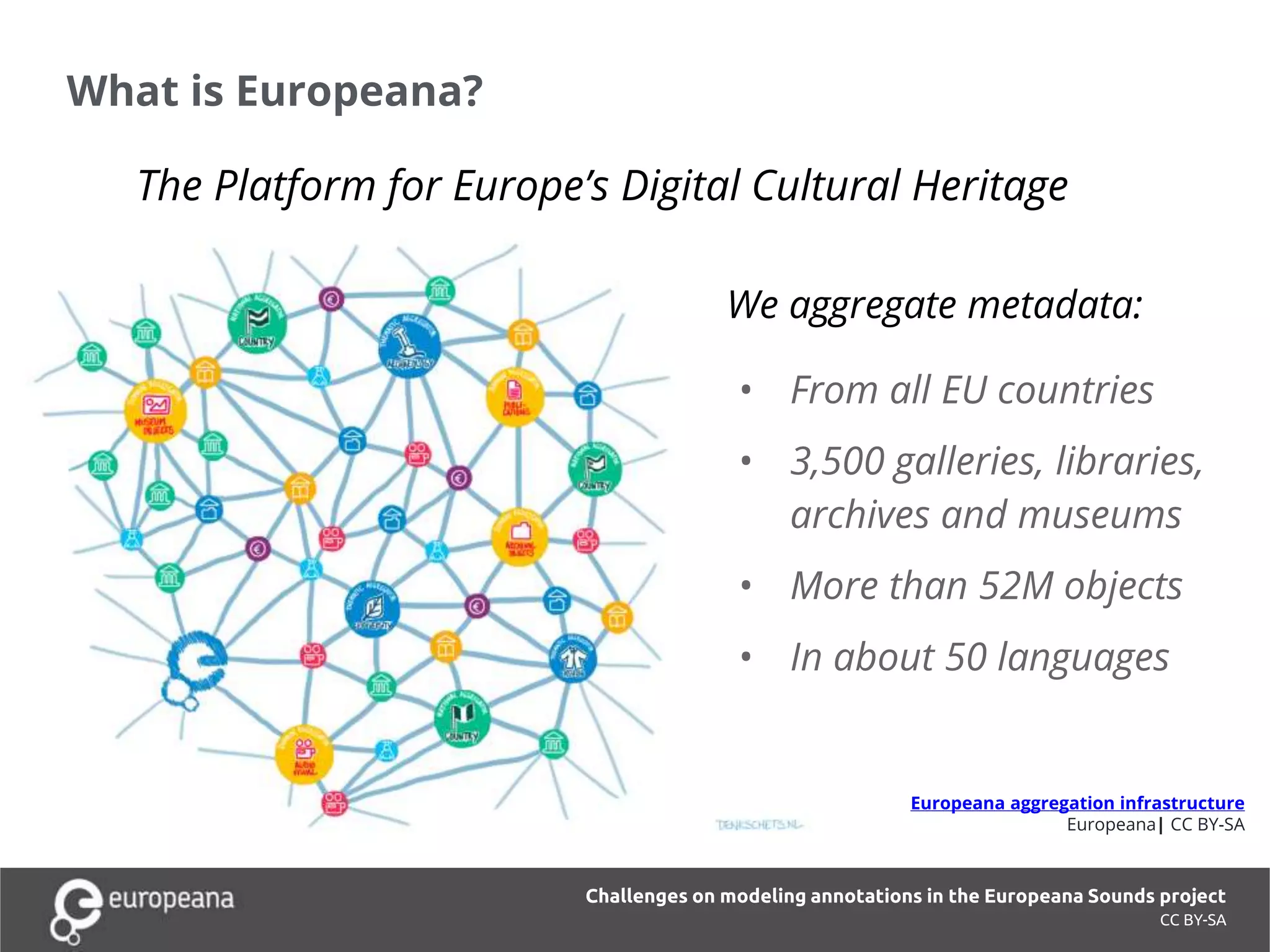 The document discusses the challenges and opportunities related to modeling annotations in the Europeana Sounds project, which aims to enhance the availability and accessibility of audio content in Europe's digital cultural heritage. It highlights various user scenarios for annotating cultural heritage objects, the importance of metadata improvement, and the adoption of the W3C web annotation data model for cross-platform compatibility. Key issues include the user experience in tagging resources, presenting semantic data, and developing a crowd-moderation policy for user-generated annotations.