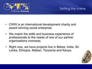 CWW is an international development charity that matches skilled professionals with partner organizations overseas for volunteer assignments. It has projects in over 25 countries across Latin America, Africa, and Asia. Professionals gain experience applying their skills in an international context while helping partners with organizational development, capacity building, and other needs. Volunteers fundraise to cover their own expenses and work as part of CWW for 3-6 months. The assignments benefit partners through needs assessments, advice, staff training, and help creating structures and systems. Professionals develop skills, experience new cultures, and make a sustainable contribution.