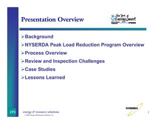 This document summarizes a presentation on challenges reviewing and inspecting demand response programs in New York. It provides background on NYSERDA's Peak Load Reduction Program and the roles of consultants in reviewing project applications and inspecting installations. Key challenges discussed include verifying large lighting projects, establishing load profiles, coordinating demand response generators, and ensuring all stakeholders are clear on requirements. The presentation emphasizes the importance of communication, scrutiny of projects, and involving all parties.