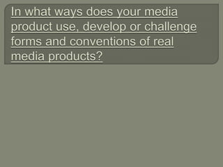 The document discusses how the creators of a country music video drew inspiration from other country music videos. They analyzed videos by Miranda Lambert, Ashley Monroe, Sam Smith, The 1975, and Blake Shelton to inform elements of shots, narrative, imagery, and tone in their own video. Key elements they incorporated included dissolve transitions between shots, casual clothing, natural imagery, a clear narrative, and sepia tones and slow motion to represent memories of the past. They also wanted to pay homage to early female country artists through a shot with dull lighting.