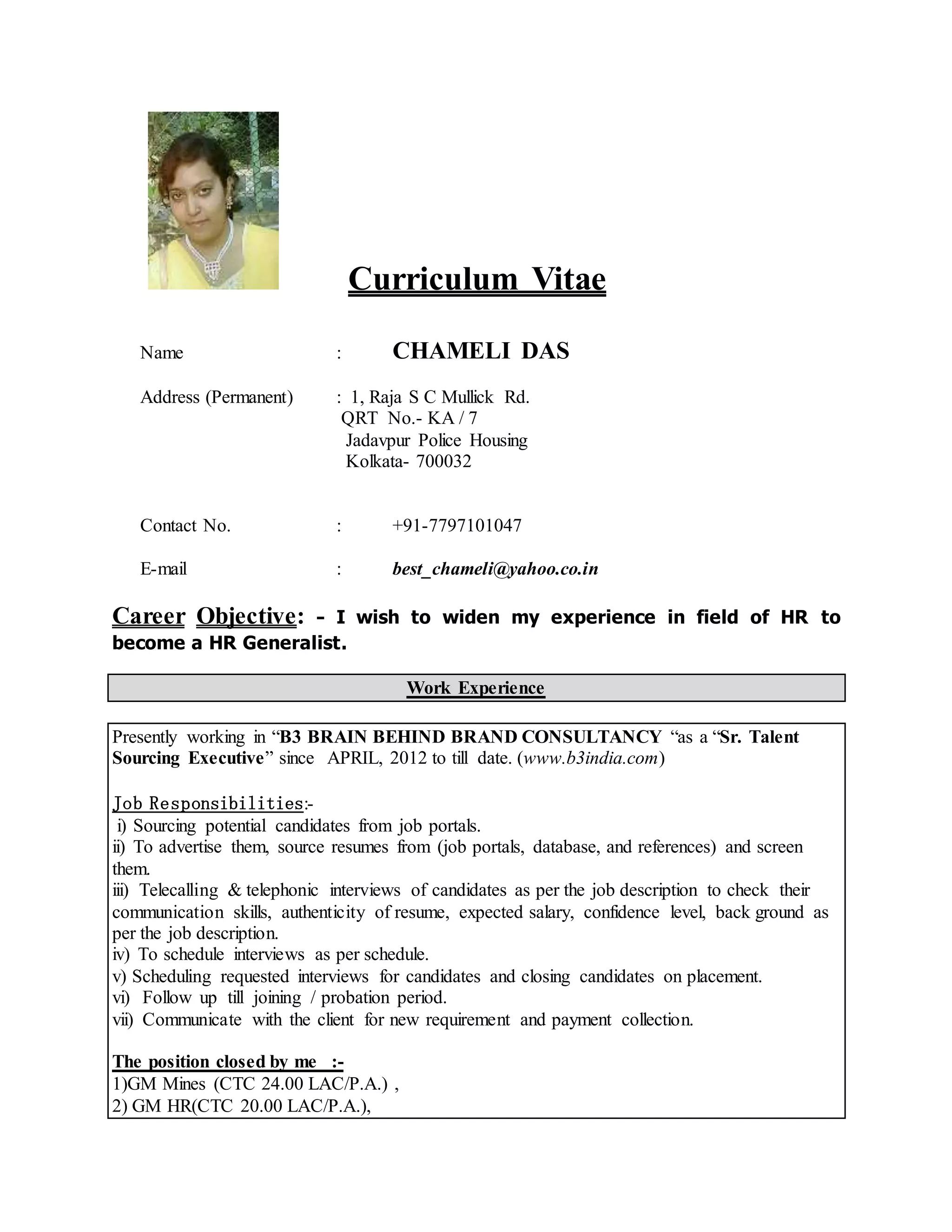 Chameli Das is seeking a position as an HR Generalist with over 9 years of experience in HR, marketing, and business development roles. She currently works as a Senior Talent Sourcing Executive where she sources candidates, conducts interviews, and has placed candidates in various executive roles with compensation packages up to 24 LPA. Previously she has held roles as a Team Leader and Marketing Executive. She has an MBA in Marketing and HR and is proficient in English, Hindi, and Bengali.