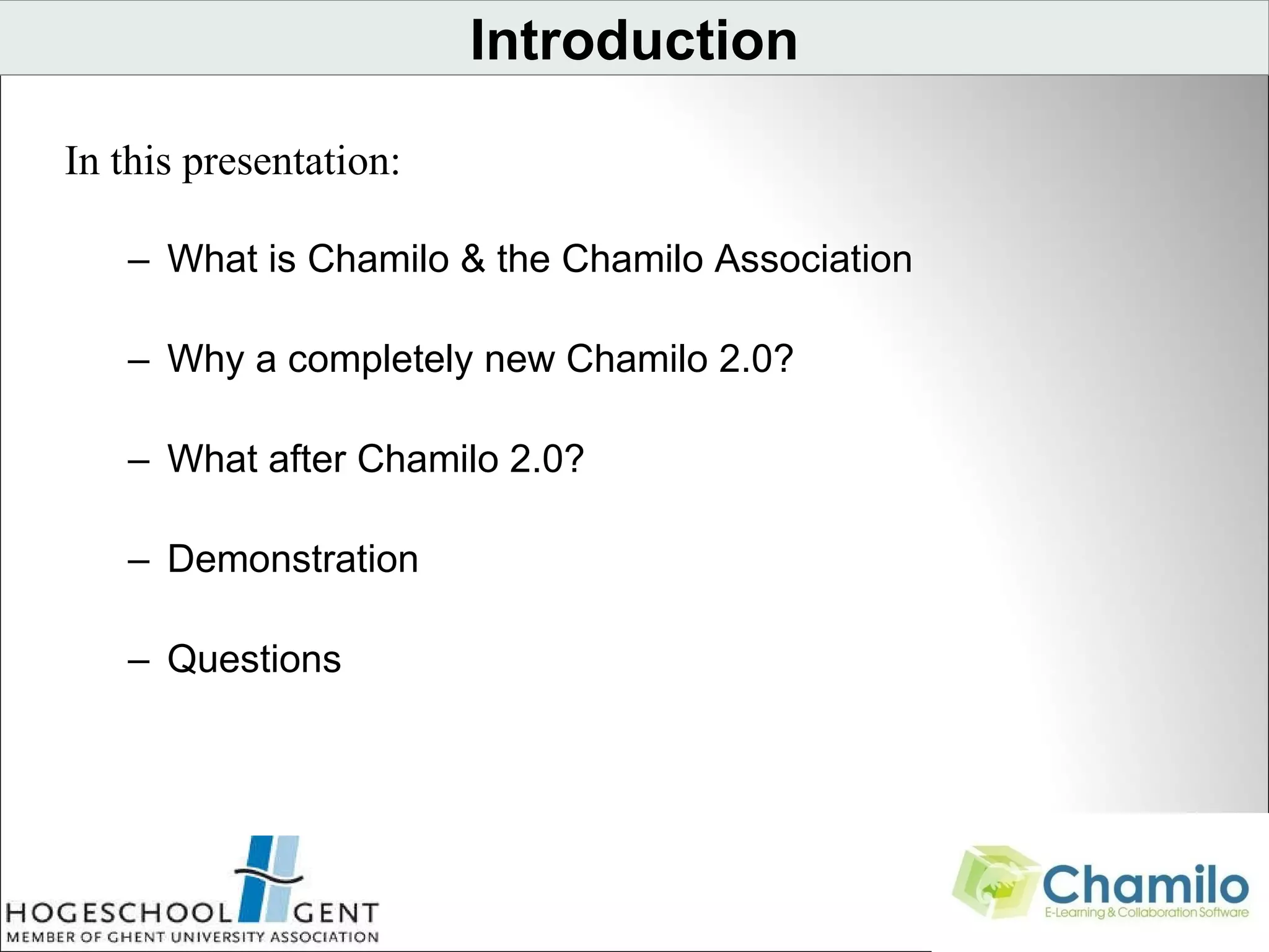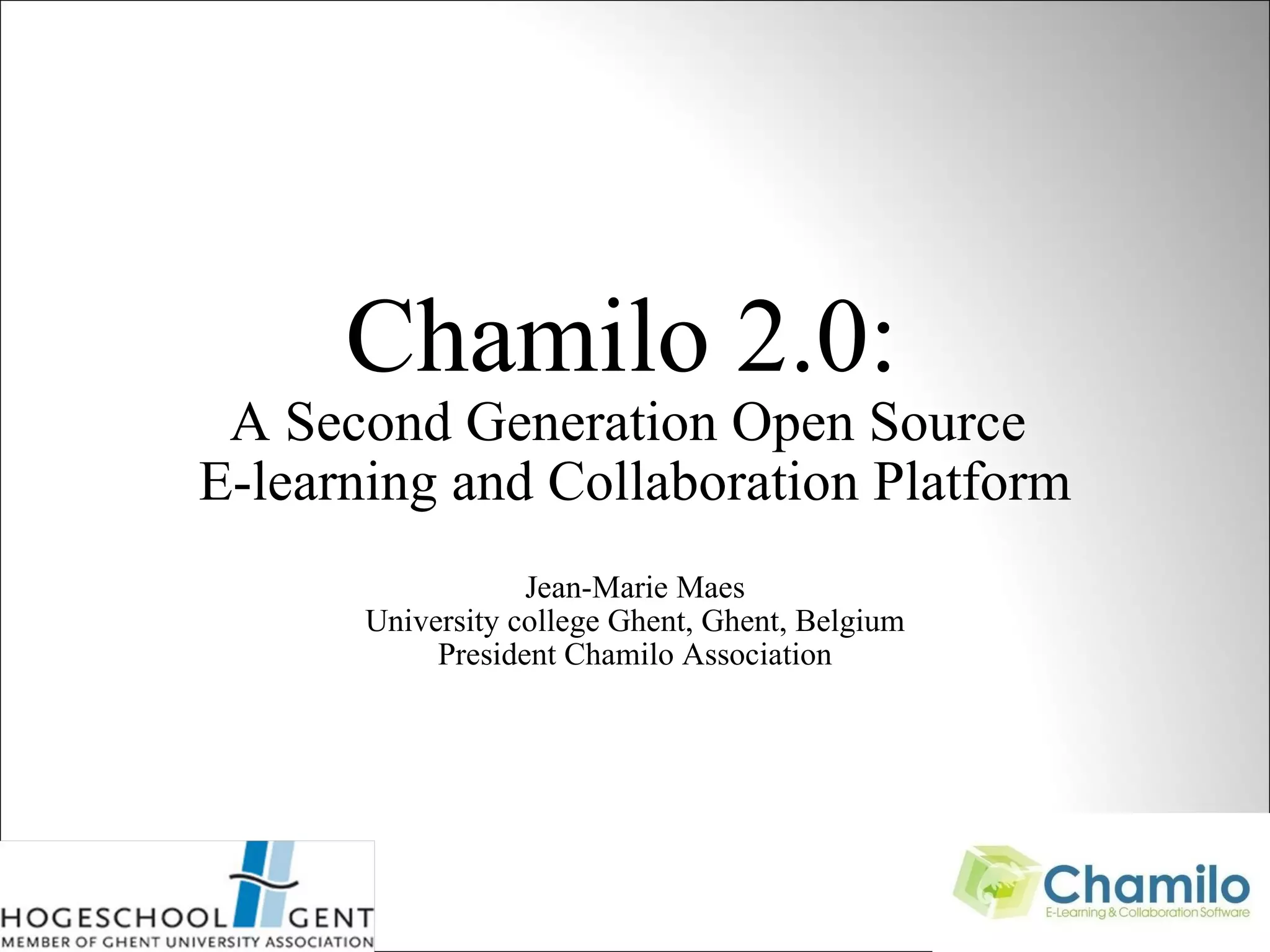 Chamilo 2.0 is a second generation open source e-learning and collaboration platform being developed by the Chamilo Association as an improvement over Chamilo 1.8.x. It features an object-oriented repository that allows for reusable and shareable objects across the platform. This new structure addresses limitations of the previous course-centric model and facilitates integration with other applications and repositories. The Chamilo 2.0 software kernel and standard modules are largely complete, while further work remains on interfaces, roles/rights, evaluation tools, and performance. The goal is to release a pre-production version in December 2010 and continue evolving the platform in a flexible way.