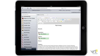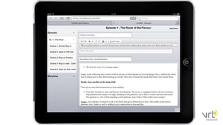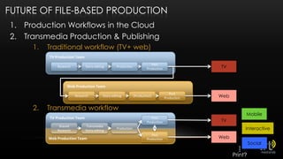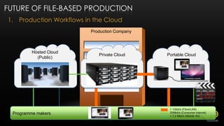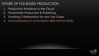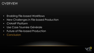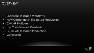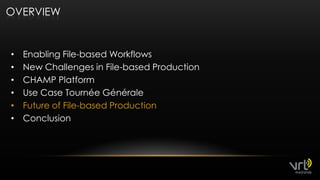 The document discusses innovation in file-based media production workflows. It begins by describing the transition from linear tape-based workflows to centralized file-based workflows using IT technology. This introduces new challenges around interoperability, asset management, automation and standardization. The rest of the document outlines a CHAMP platform that aims to address these challenges and provide fit-for-purpose tools. It then provides a use case example of using such tools for a tour production. Finally, it discusses future trends like cloud-based production workflows and transmedia storytelling across multiple platforms. The conclusion emphasizes focusing on both operational excellence and differentiating technology.