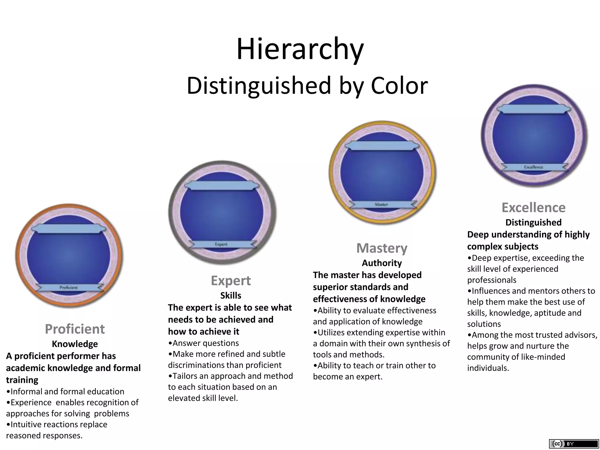 The document describes different levels of expertise - proficient, expert, mastery, and excellence. It provides descriptions of the characteristics associated with individuals at each level. A proficient performer has formal education and training, and can recognize approaches to solve problems. An expert can determine what needs to be achieved and how to achieve it, can make refined discriminations, and tailors their approach to each situation. A master has superior standards and knowledge application abilities, and can teach others. Those demonstrating excellence have deep understanding of complex subjects and influence and mentor others.