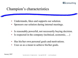 The document discusses champions in the sales process. It defines a champion as someone within a company who understands and supports a proposed solution, sponsors it internally, and uses it to achieve their own goals. Champions are described as critical to making sales as no sale happens without one. The more powerful the champion, the shorter the sales cycle and larger the deal. The document provides tips for identifying potential champions before, during, and after a sales demonstration, as well as testing a potential champion's commitment by having them provide information, set higher level meetings, and role play objections.