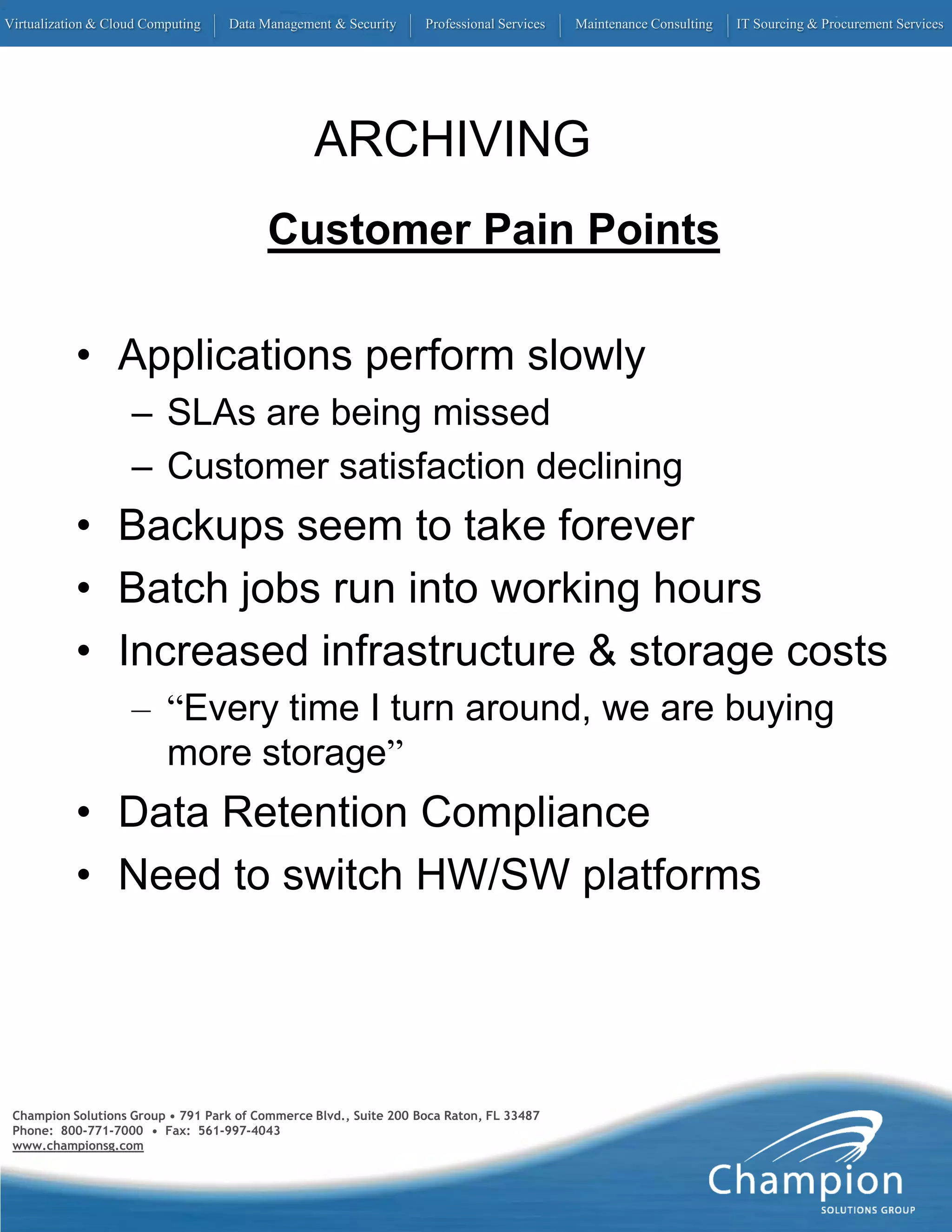 The document outlines various pain points faced by customers in virtualization, cloud computing, data management, and security, highlighting issues such as slow application performance, compliance challenges, and data retention costs. It emphasizes the need for effective solutions in test data management and data privacy while facing increasing infrastructure expenses. Champion Solutions Group offers professional services to address these challenges and improve customer satisfaction.