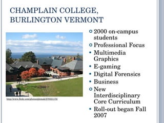 The document outlines Champlain College's approach to embedding information literacy within its new interdisciplinary core curriculum. It emphasizes data-driven assessments to track student learning and collaborative efforts to address challenges in educational practices. The need for a proactive culture of tolerance for uncertainty and iterative improvement in teaching strategies is also highlighted.