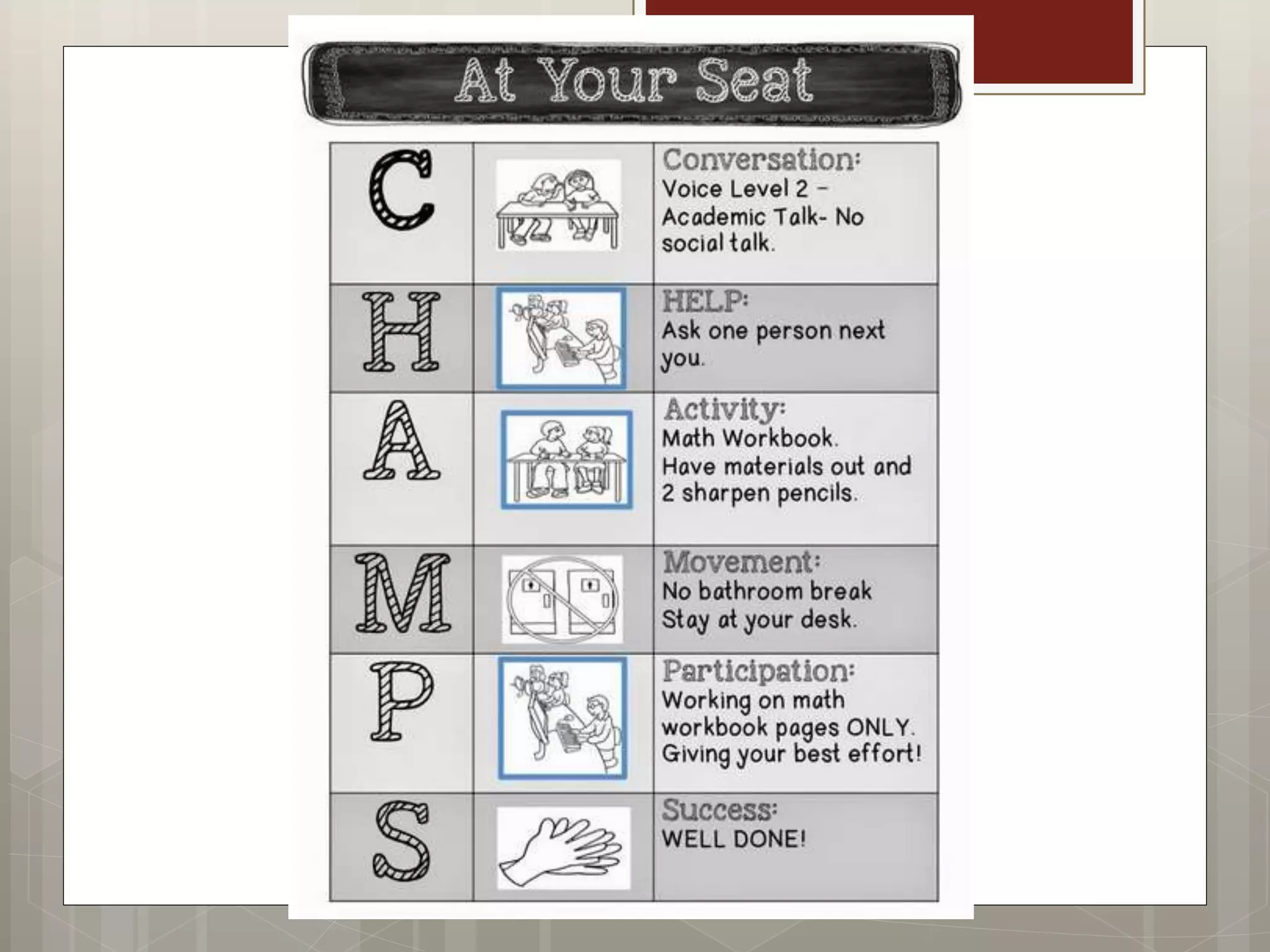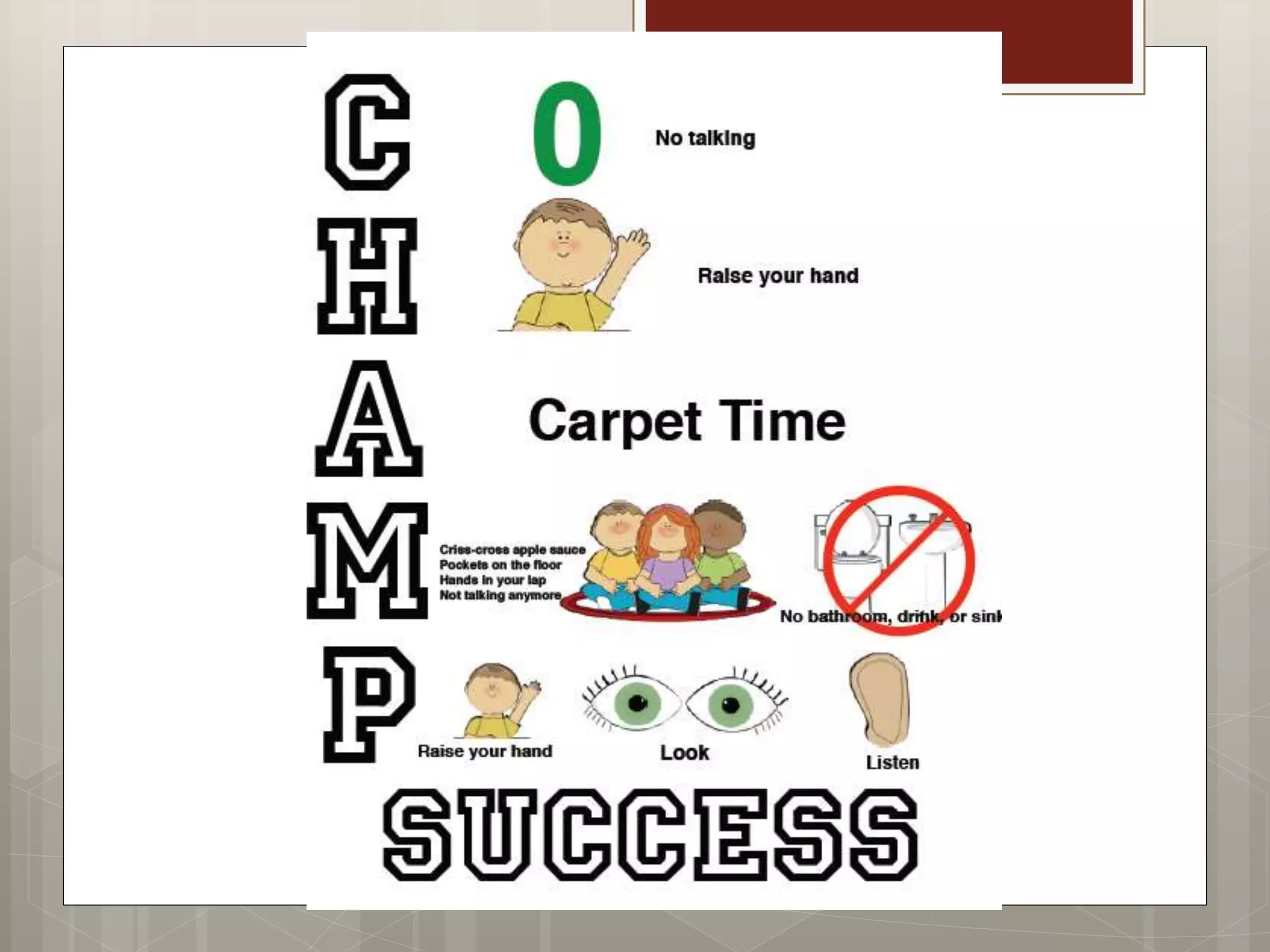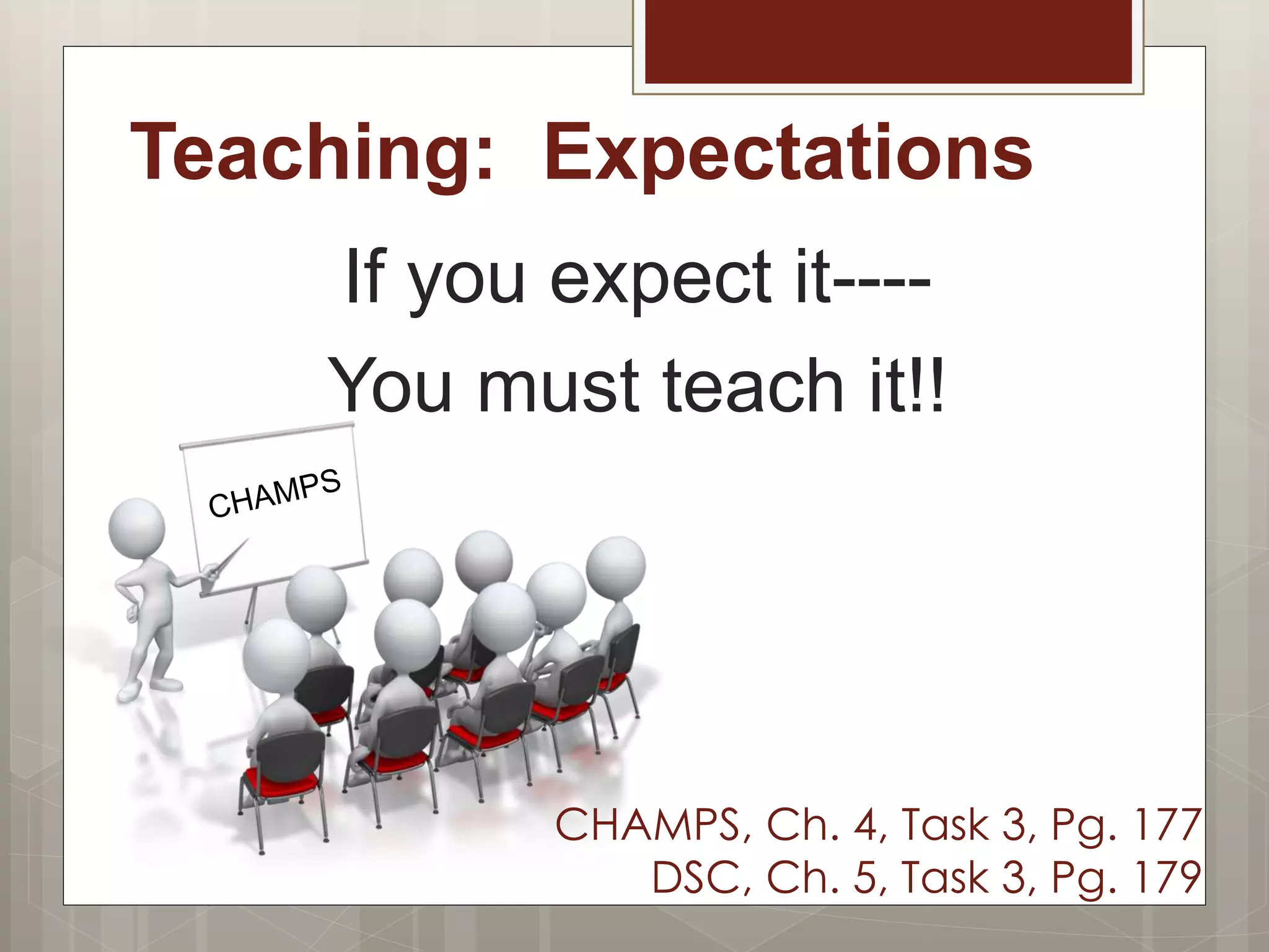 The document outlines effective strategies for teaching behavioral expectations in the classroom using the CHAMPS framework. Key elements include modeling, practicing, and reinforcing expected behaviors while providing frequent opportunities for feedback and error correction. It emphasizes the importance of ongoing instruction and visual aids, as well as adapting teaching methods in response to classroom dynamics.