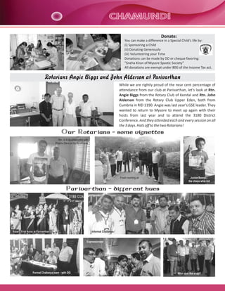 The document discusses an upcoming event hosted by Rotary Mysore to benefit Sneha Kiran, an organization that helps children with cerebral palsy. Rotary Mysore gifted a wheelchair to a recipient named Kishore through Sneha Kiran. Ms. Shashikala from Sneha Kiran thanked Rotary Mysore for their long-time support and requested donations for a fashion show and dinner fundraiser on January 26th. The document also recognizes the many contributions of Rotary Mysore members to a recent Rotary conference.