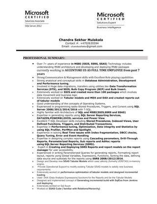 This document contains the resume of Chandra Sekhar Mulakala, who has over 7 years of experience working with MSBI technologies like SSIS, SSRS and SSAS. He has extensive experience developing ETL packages, reports and tabular models. Some of his responsibilities include managing teams, requirements gathering, development, testing, performance tuning and providing support. He has worked on multiple projects for clients like AT&T, Microsoft and BestBuy across various domains.