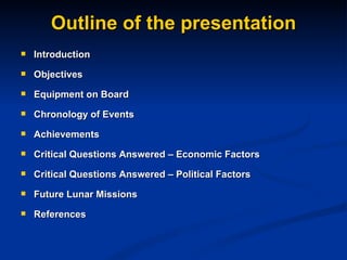 Chandrayaan-1 was India's first unmanned mission to the moon, launched in 2008. It placed India in an elite group of space-faring nations. The mission's objectives were to conduct scientific experiments using instruments onboard the spacecraft to produce high-resolution maps of the lunar surface and its composition. It achieved most of its objectives and transmitted over 40,000 images in 75 days at a very low cost of $80 million, demonstrating India's capabilities in space technology.