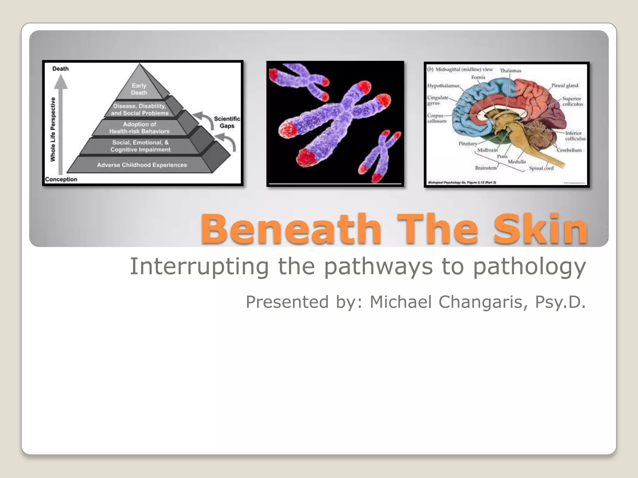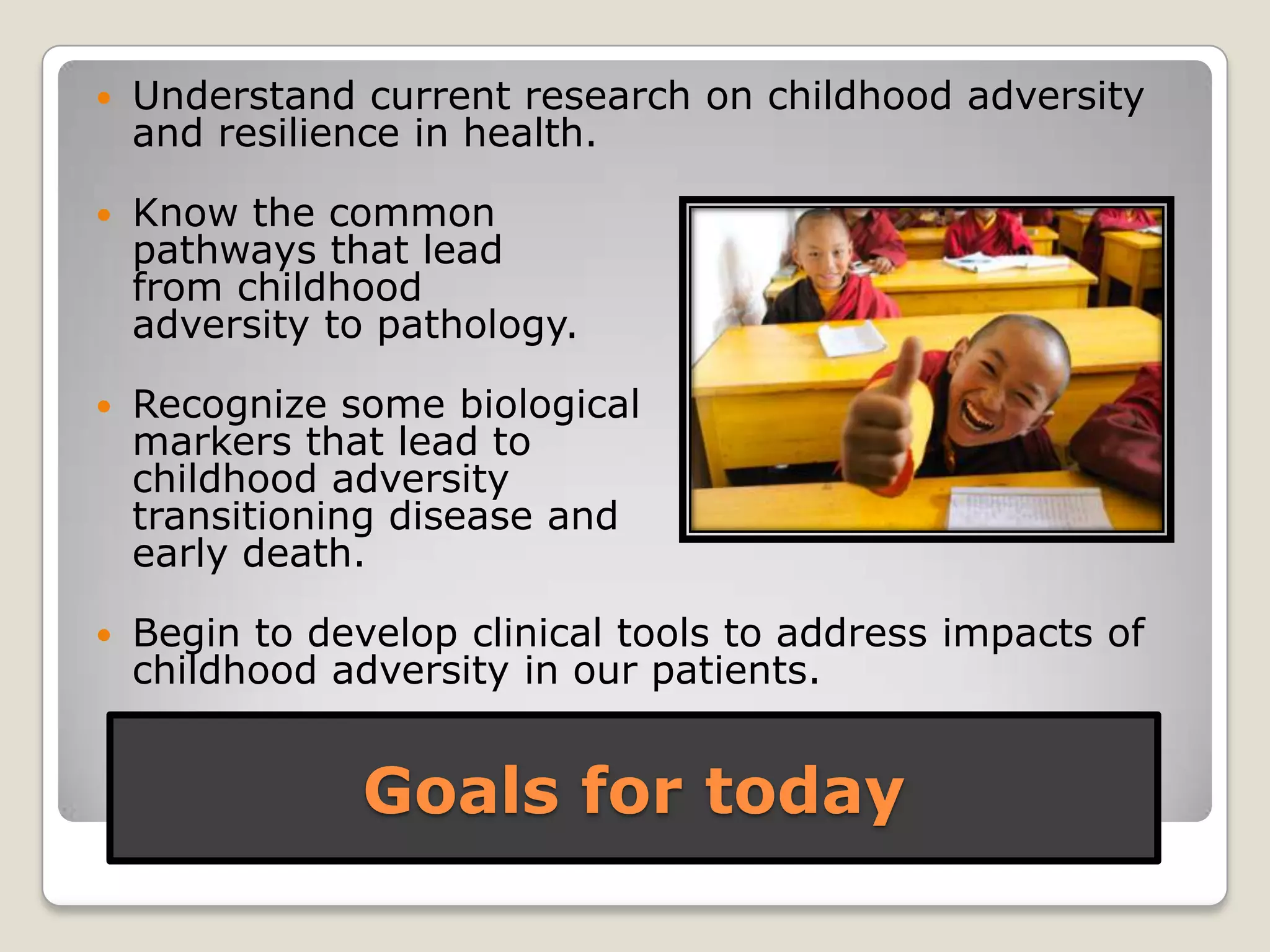 The document discusses childhood adversity and its impacts on health, emphasizing the biological and social pathways that lead to pathology. It highlights significant statistics regarding the effects of adversity, such as increased risks of autoimmune diseases and depression, and proposes clinical tools to address these consequences. Key factors for resilience include strong social support, positive family relationships, and effective coping strategies.