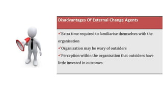The presentation discusses the role of change agents in managing organizational change, classifying them into internal and external types. Change agents are essential for successful transformations and can be managers or consultants, using various strategies to implement change. Their effectiveness is linked to skills like resilience, insight, and empathy, as well as their ability to communicate and relate to clients.