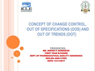 This document discusses concepts of change control, out of specifications (OOS), and out of trends (OOT) in pharmaceutical quality assurance. It defines change control as a procedure to review, verify, regulate, manage, approve and control changes made to systems or processes. OOS refers to test results that fall outside pre-defined acceptance criteria, while OOT describes results that do not follow expected trends. The document outlines procedures for investigating and managing changes, OOS, and OOT to ensure product quality and compliance with regulations.
