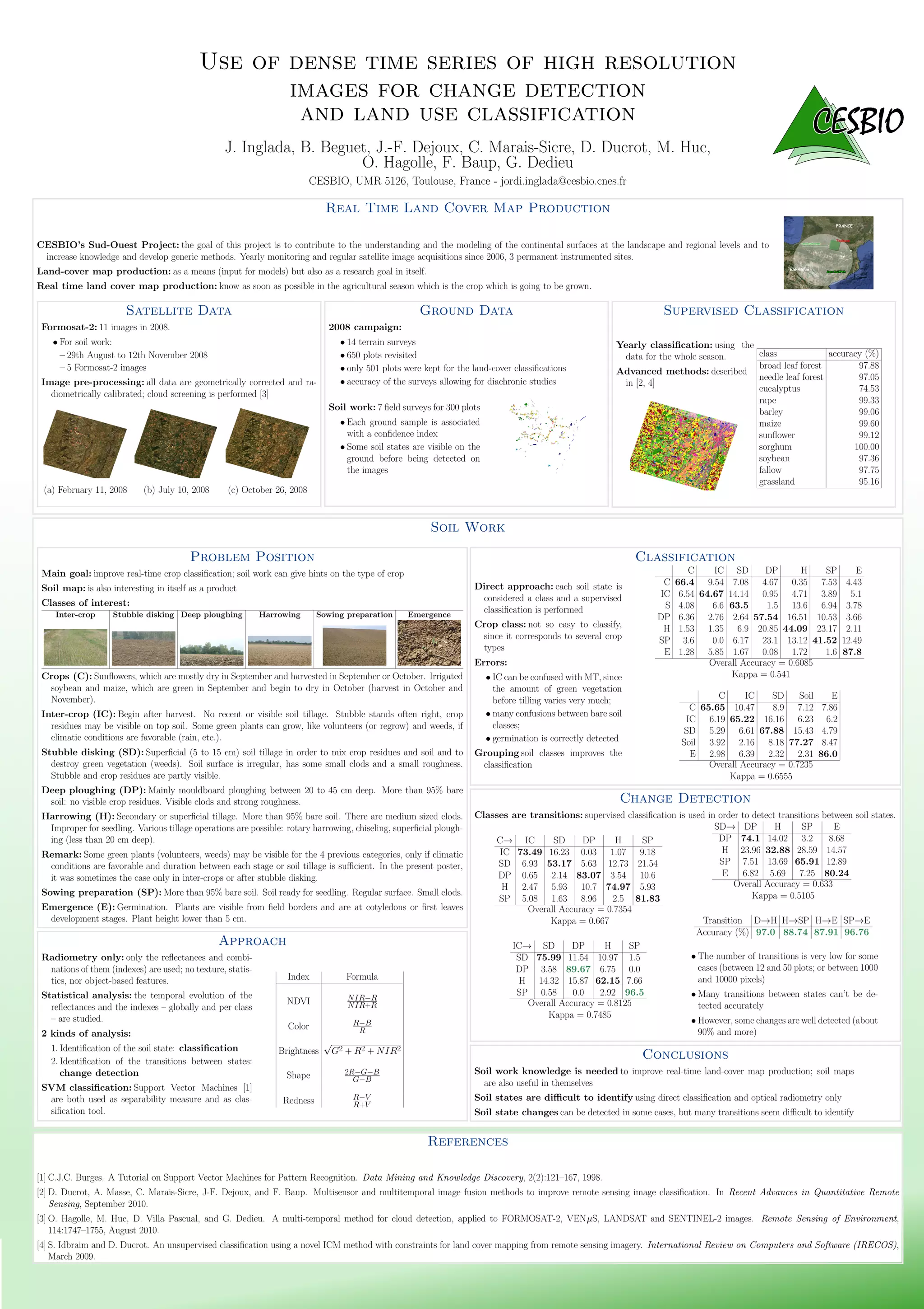 This document discusses using high-resolution satellite imagery time series to detect land use changes and classify land cover. It presents a project that aims to produce real-time land cover maps using Formosat-2 imagery of southwest France. Supervised classification of imagery from 2008 achieved overall accuracy of 60-72% for differentiating crops, fallows, and various soil work classes like stubble disking and plowing. Change detection between soil states was also explored, with some transitions detected accurately around 90% but many others more difficult to identify reliably. Overall, the results indicate soil state information can help improve crop classification, but direct radiometric classification of soil classes and their changes remains challenging.