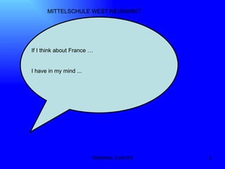 The document summarizes a student exchange program between schools in Neumarkt, Belfort, Lund, and Zaragoza. Students from Neumarkt visited Belfort from May 15-20, 2011. While there, they stayed with host families, attended school, and experienced French culture through food, customs, and sights. The students found the French pupils friendly despite some language barriers, were impressed by the large homes and luxurious equipment, enjoyed diverse local foods, and appreciated the custom of greeting with kisses. The trip provided exposure to both traditional and modern tourist attractions in Belfort.