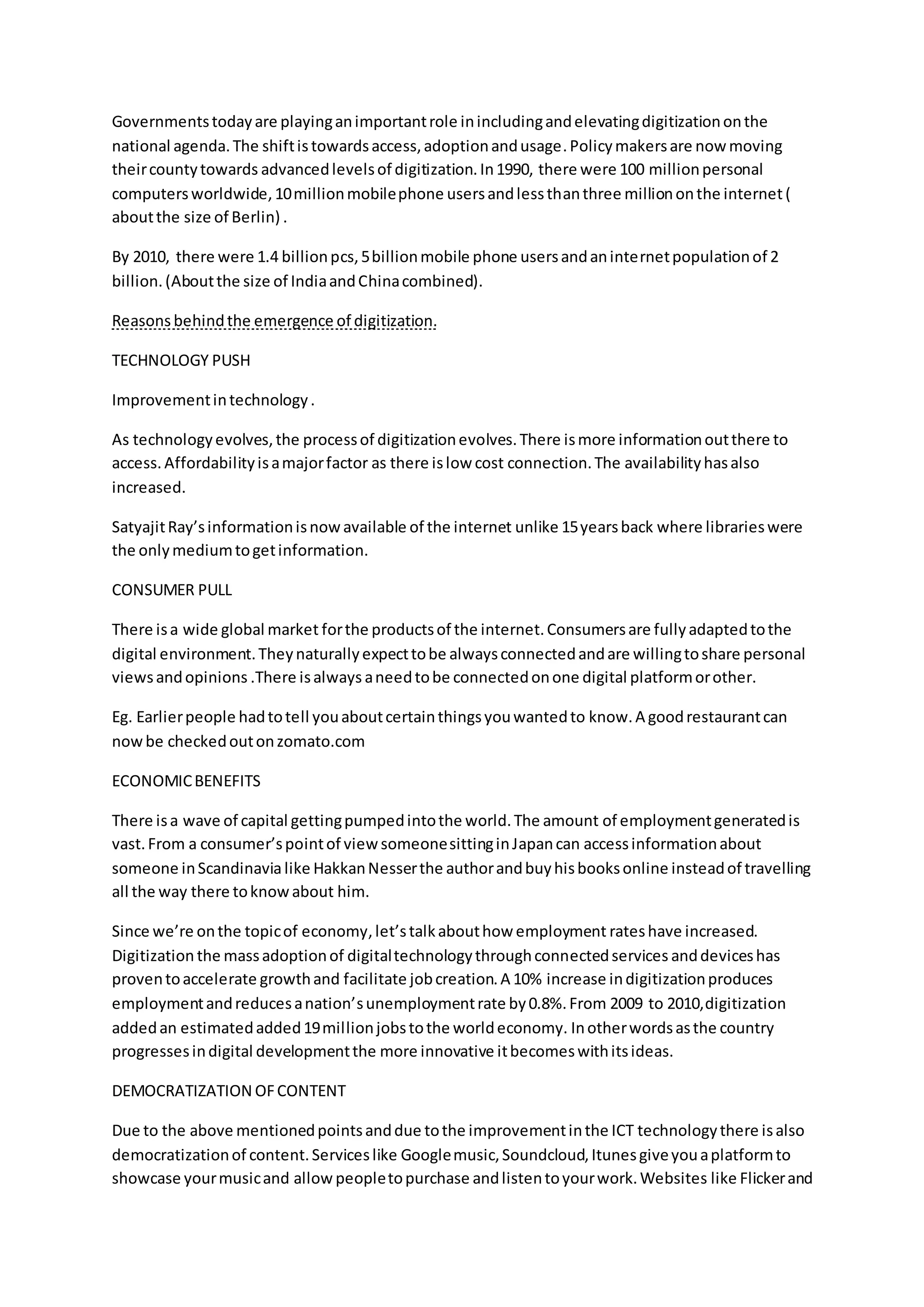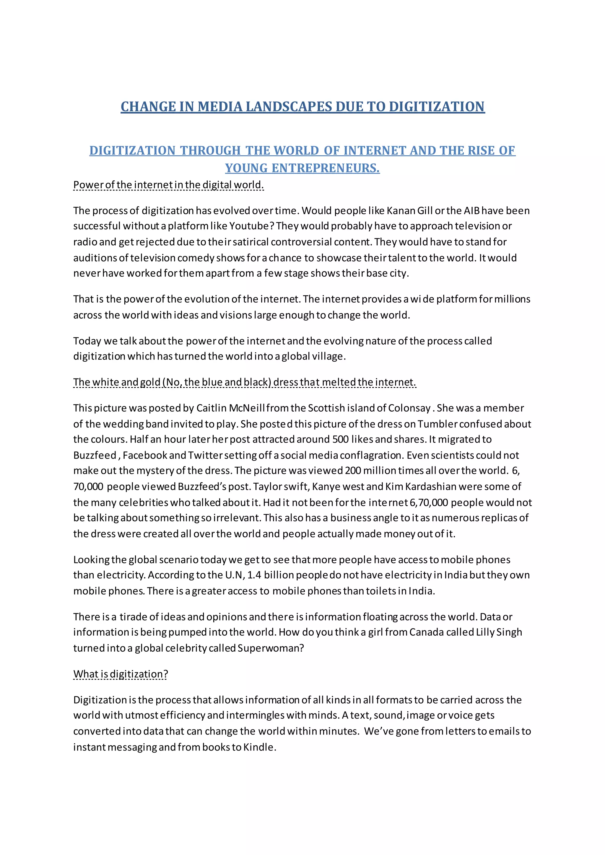 The document discusses how digitization has changed media landscapes and enabled the rise of young entrepreneurs through platforms like the internet and YouTube. It provides examples of comedians and artists like Kanan Gill and AIB who were able to find audiences online that may not have been possible otherwise. The power of digitization lies in providing a global platform for ideas to change the world. It has led to the democratization of content by giving artists and creators ways to showcase their work. Young entrepreneurs are now launching their own companies and pursuing alternative careers like blogging that rely on digital platforms and opportunities.